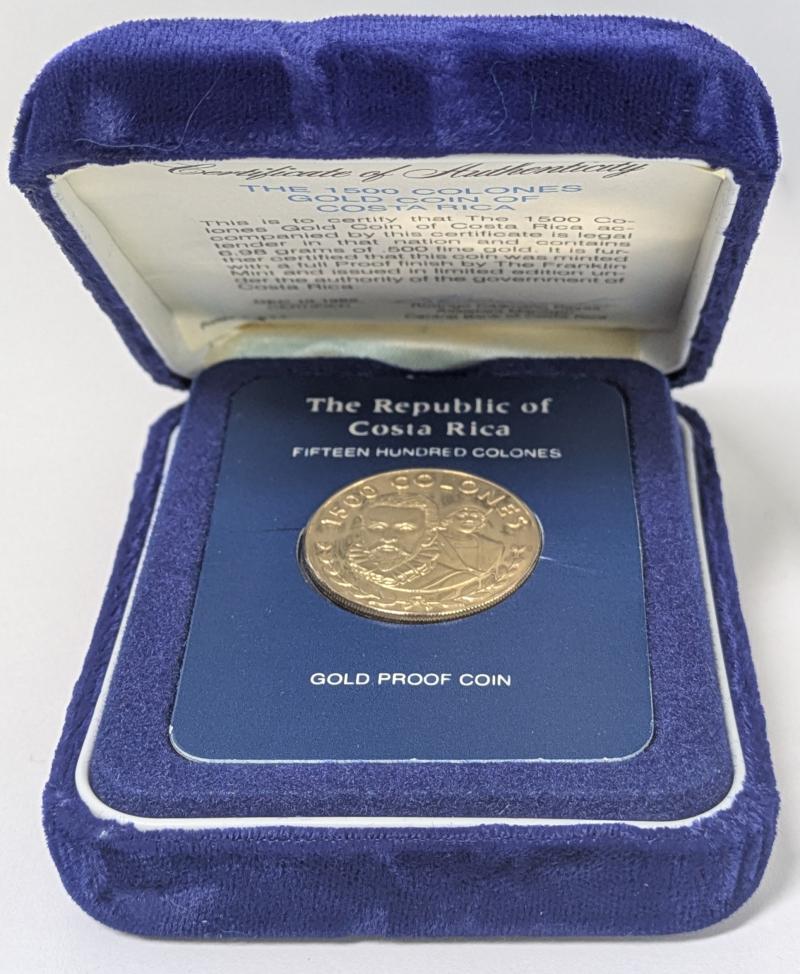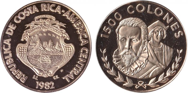 COSTA RICA: 1982 1500 colones gold (6.98g 0.500) Proof KM 213, rev. Francisco Coranado and Christopher Columbus, cased with