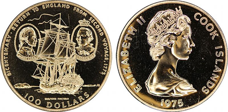 COOK ISLANDS: 1975 $100 gold (9.60g, 0.900) KM13, rev. Captain Cook, HMS Resolution, George III, cased with certificate. (Image1)