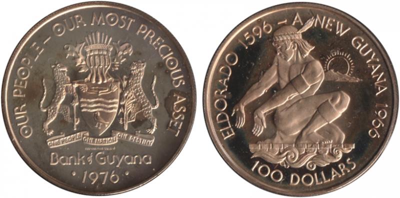GUYANA: 1976 $100 gold (5.74g 0.500) Independance Proof KM 46, rev. Arawak Indian, in Franklin Mint case, no certificate. (Image1)