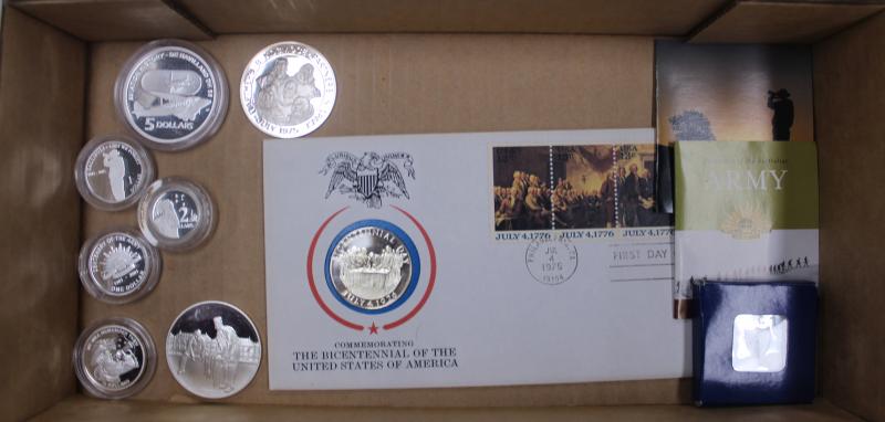 Silver World coins and medallions, includes Australia 1988 $2 Proof x2, $1 (11.66g 0.999) 2001 Army & 2005 Gallipoli Proofs, $5