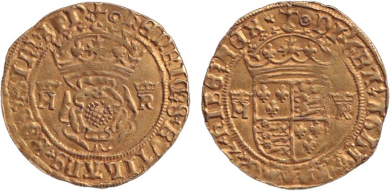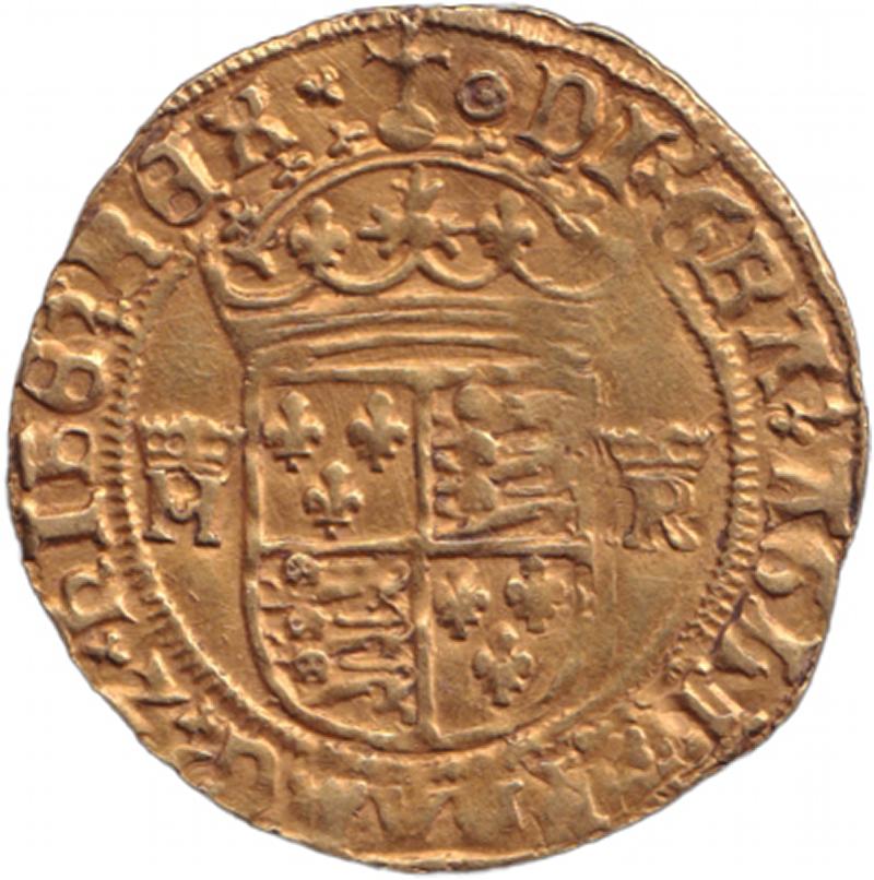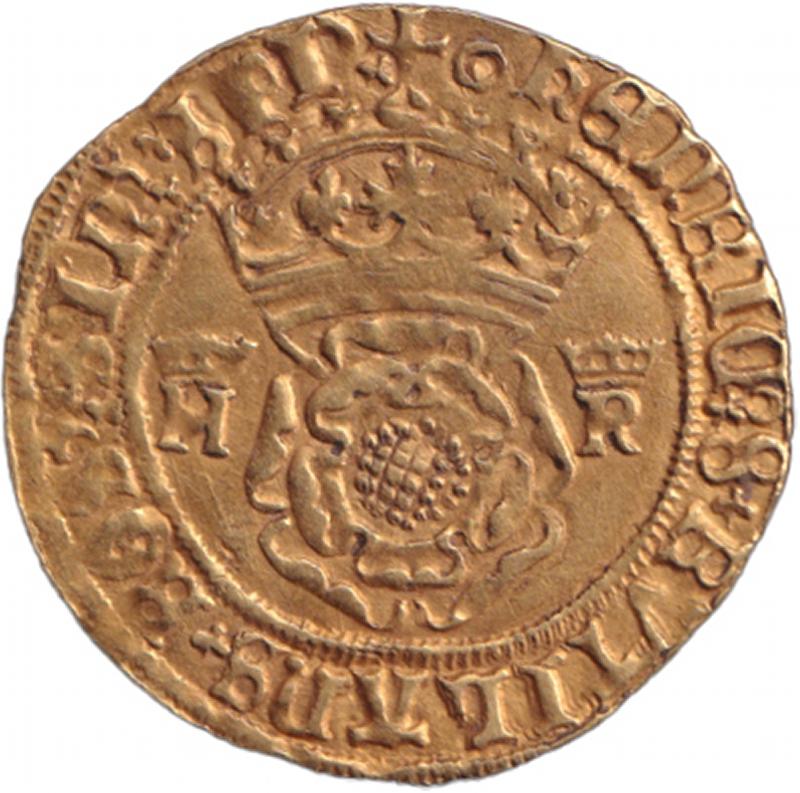 obv. Crowned Tudor Rose between '[crown]/H' & '/R' surrounded by Lombardic text '+H€NRIC*8 RVTILANS +ROS*SINI SPI+' (Henry 8 a shining rose without a thorn), rev. Crowned Shield between '[crown]/H' & '/R' surrounded by 'Di+GRA;GLI AMD hIB€; REX',