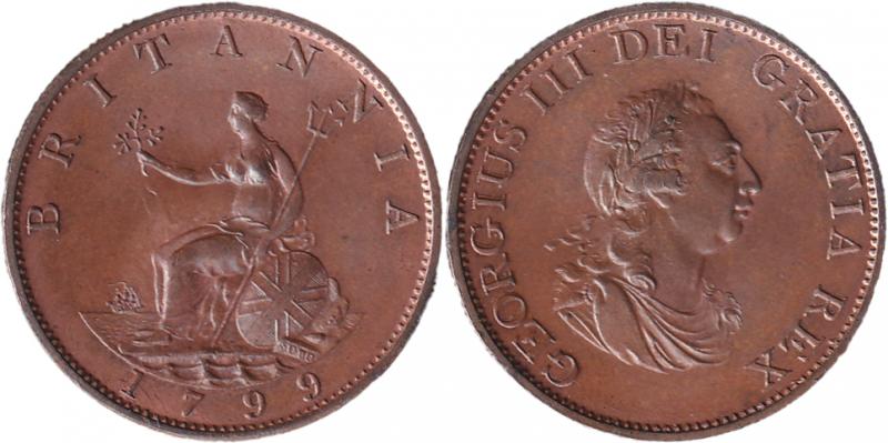HALFPENNY: 1799 George III ½d Spink 3778 raised line on ship hull, Uncirculated. (Image1) (Image2)