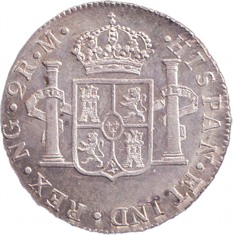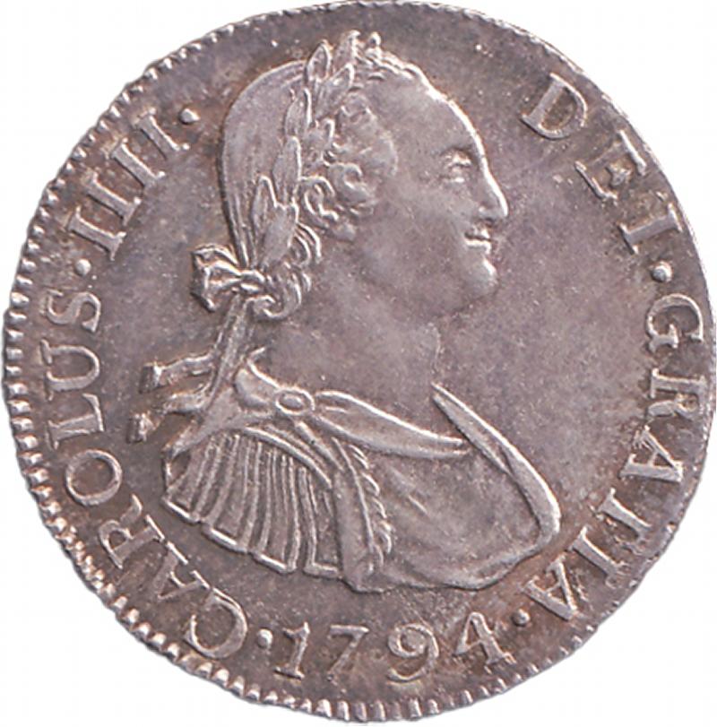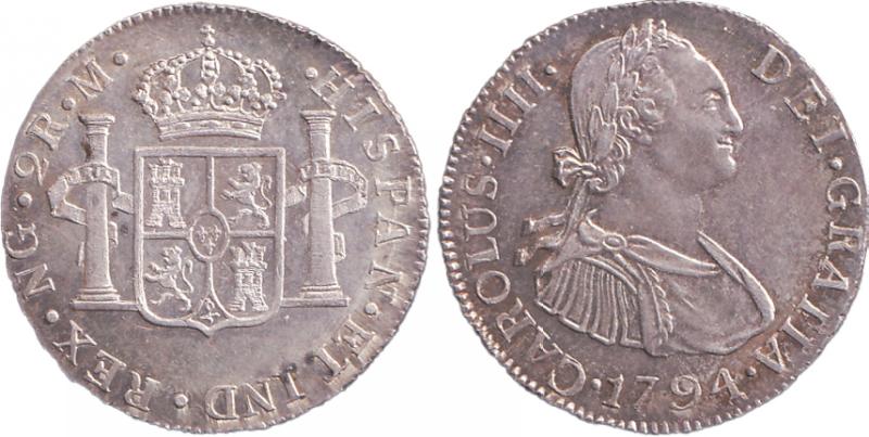TWO REALES: 1794 Charles IV 2r KM 51 mintmark 'NG M' Nuevo Granada, EF. (Image1) (Image2)