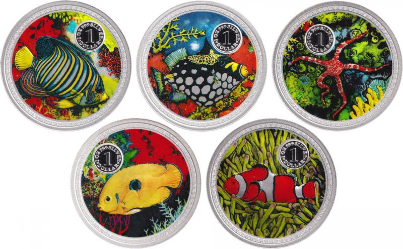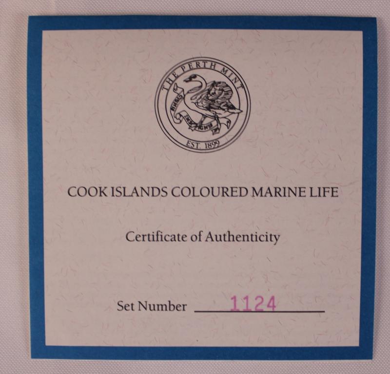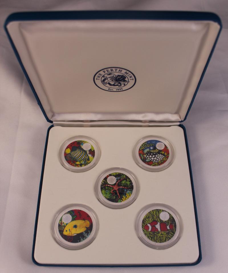 1999 Silver Marine Collection $1/1oz silver (0.999) Perth Mint coloured set of five cased with certificate #1124 and cardboard