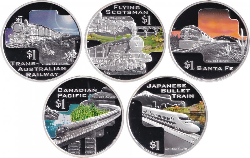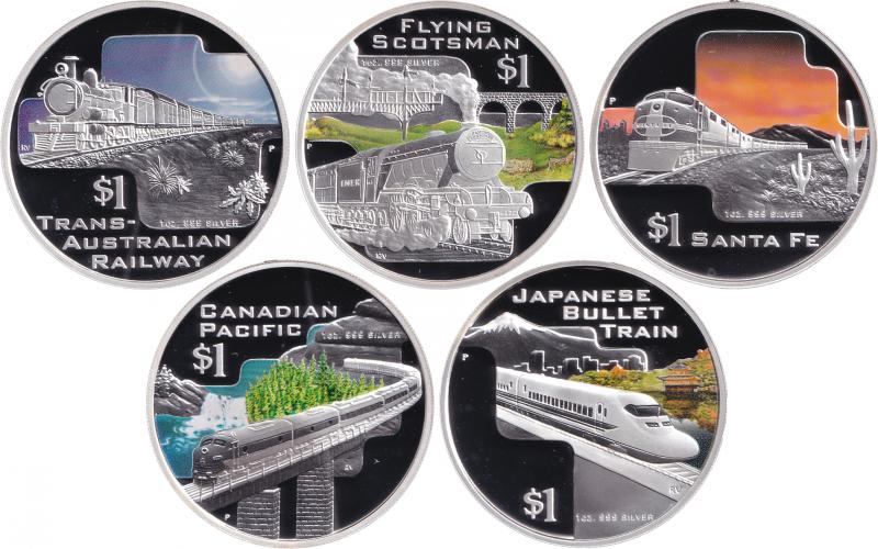 2004 Great Railway Journeys Of The World $1/1oz silver (0.999) coloured cased set of five with certificate #0475 and cardboard