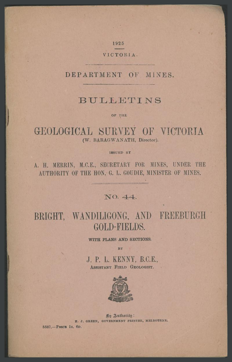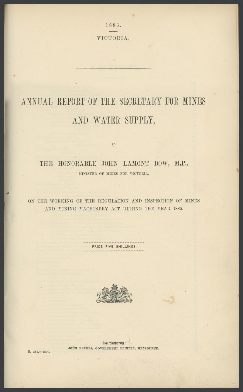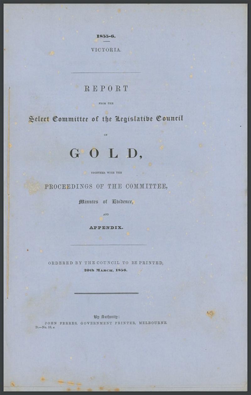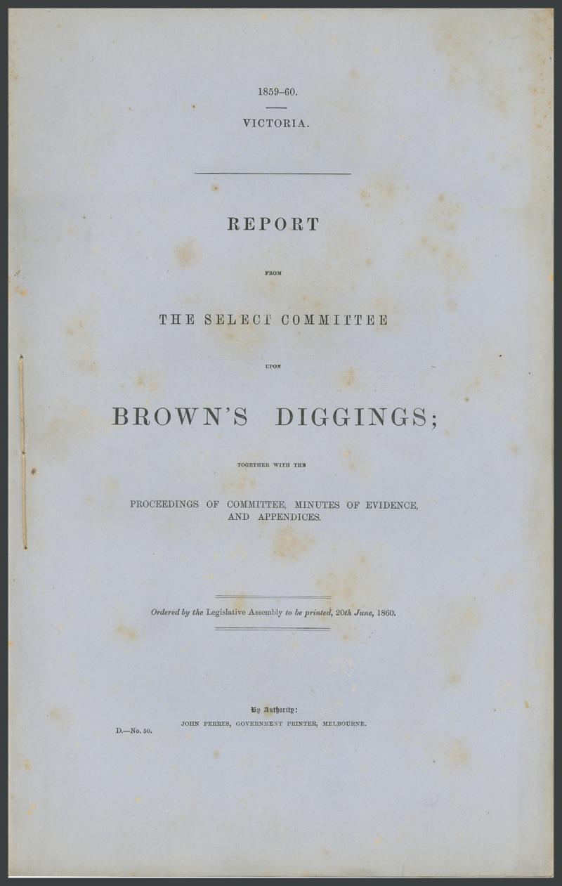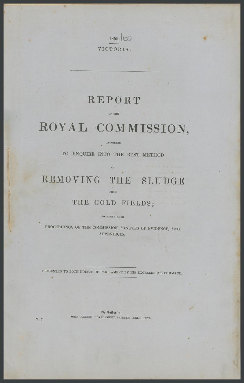 'Removing the Sludge from the Goldfields' (1859), 'Select Committee on Brown's Diggings' (1859-60), 'Annual Report of the Secretary for Mines' (1886, bound), 'Report on the Walhalla Gold-Field' (1901; bound with numerous maps & plans), also