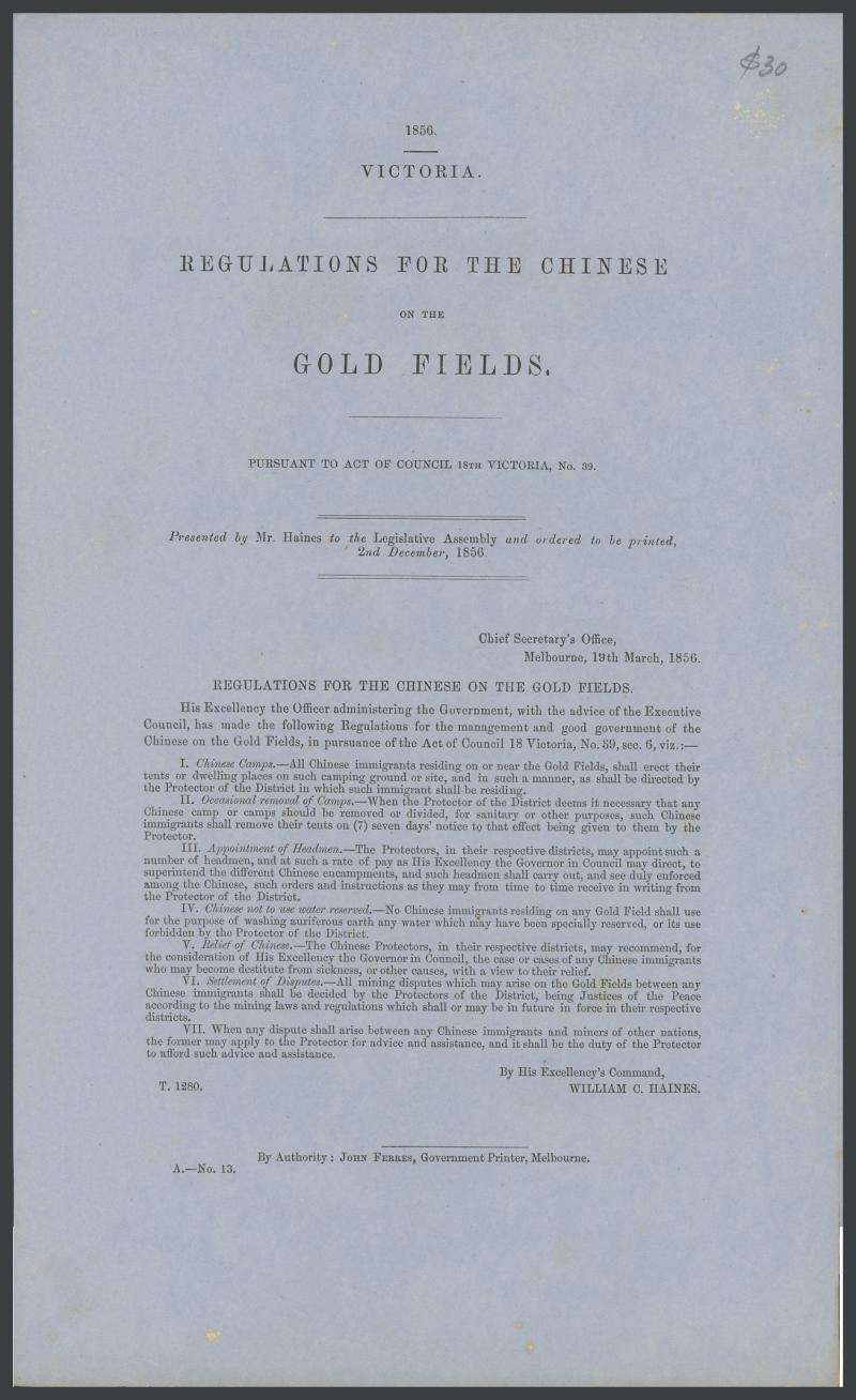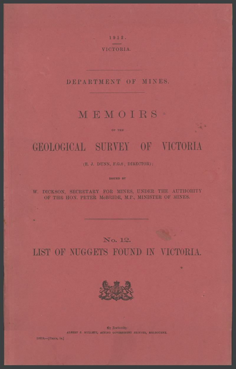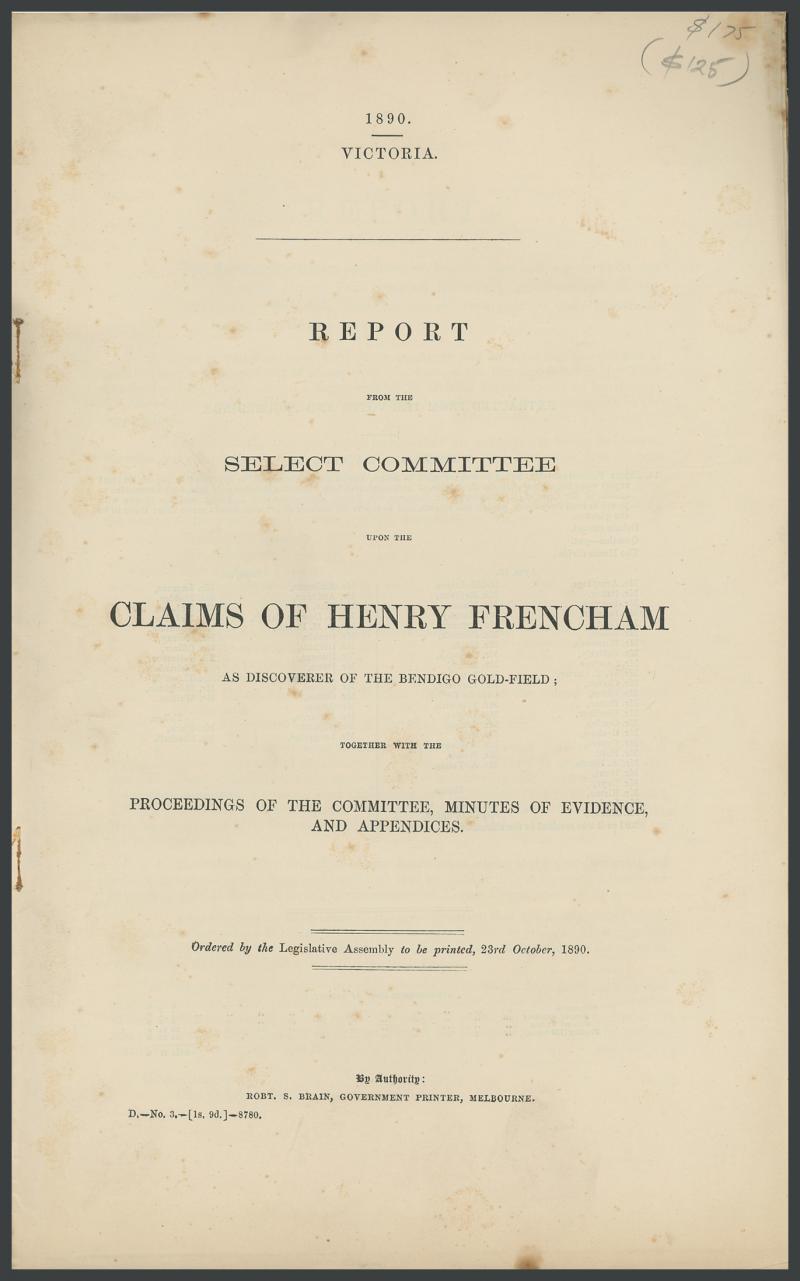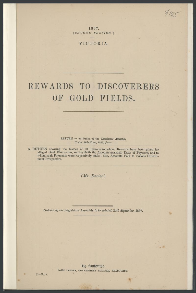 'Regulations for the Chinese on the Gold Fields' (1856), 'Rewards to Discoverers of Gold Fields' (1867) and '...Claims of Henry Frencham as Discoverer of the Bendigo Gold-Field' (1890), 'List of Nuggets Found in Victoria' (1912), folio of large maps