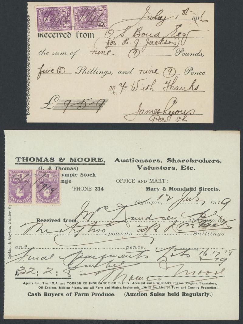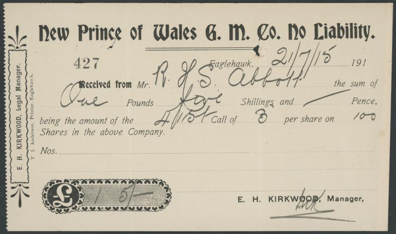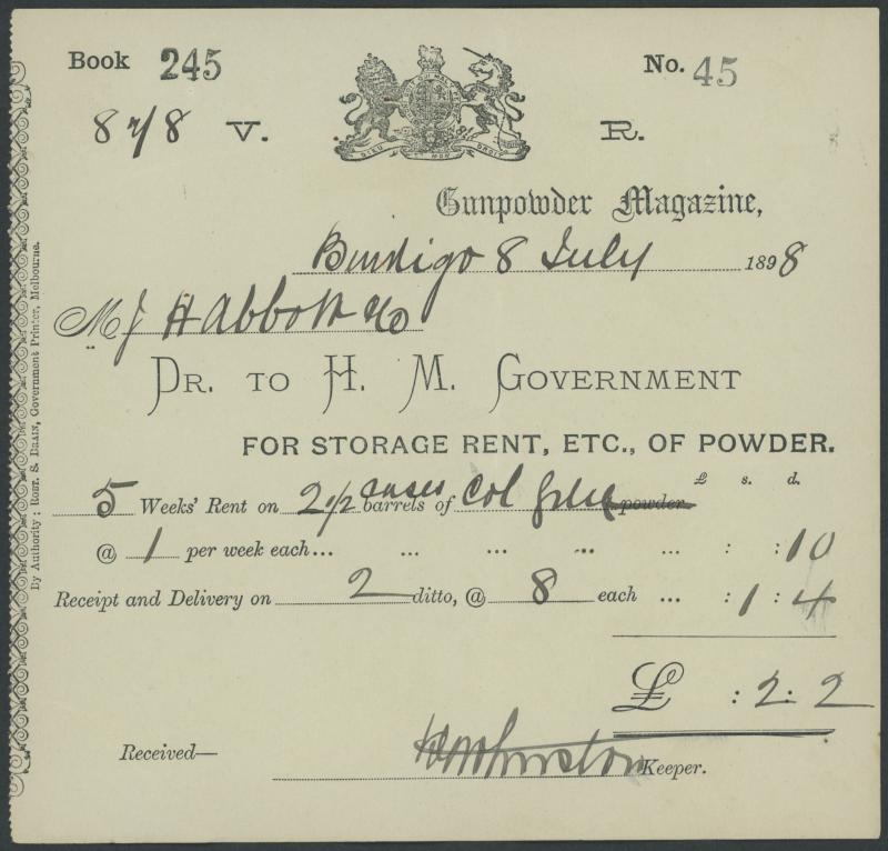 Right to Sarah Ann Dyer of Ballarat; 1898 Victoria Gunpowder Magazine receipt to H Abbott & Co of Bendigo, mainly Fine.
