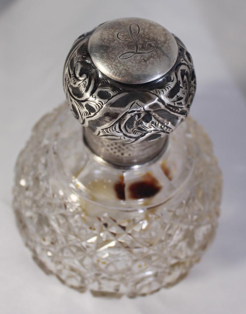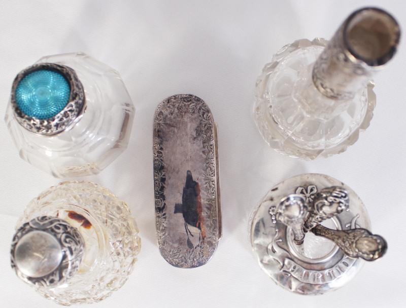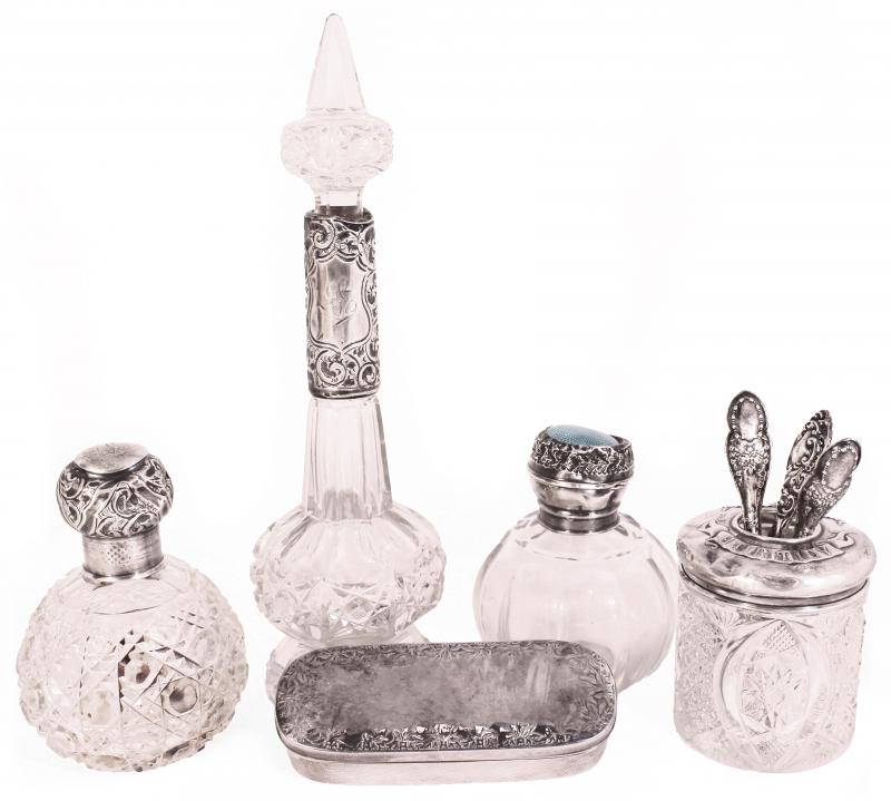 Lady's vanity set circa 1920s, various vintage crystal and silver nail/hair care containers, & silver makeup case (152g 0.98).