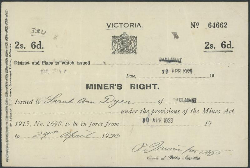 AUSTRALIA: Documents including 1926 South Australia Miner's Right to William George O'Hara of Mt Gambier; 1929 Victoria Miner's