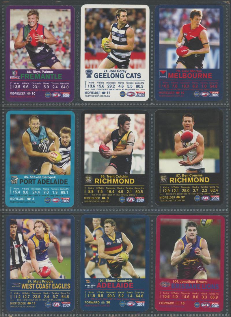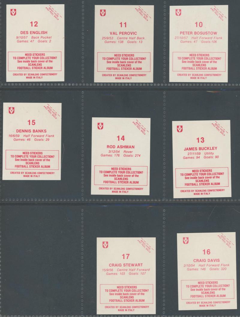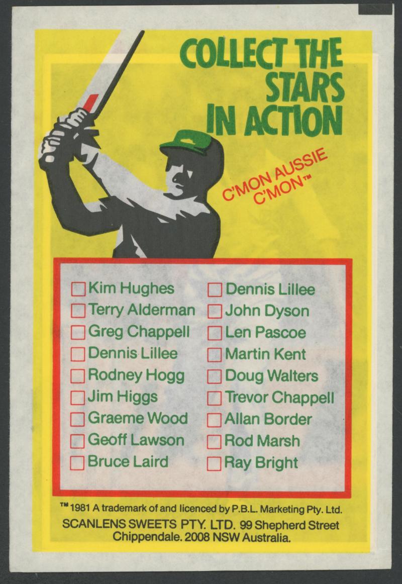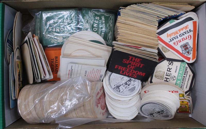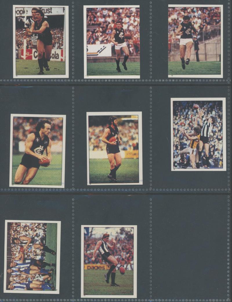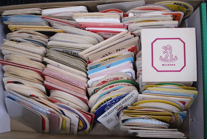 postcard wallets (x19); trade cards (200+); football cards (100+) with 1983 Scanlens Football Sticker Albums (empty x 120+); 1981 Scanlens 'Cricket Superstars' large size (14) in packets; phone cards (100); few badges & tazos; drink coasters (100s),