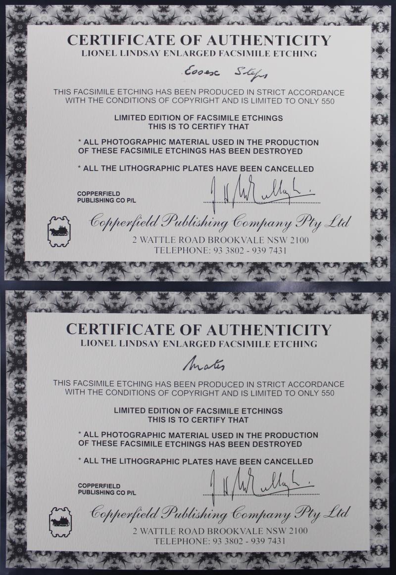 Aboard', 'Land of the Crow', 'Ashmore House', 'Mates', 'Post and Mail', 'Hunter Street Sydney', 'Essex Steps', 'Plant Auction - Hunter Street', 'His Only Pair', 'The Summit', 'The Shanty on the Rise', 'Cobb and Co' & 'Fossikers', all limited editions