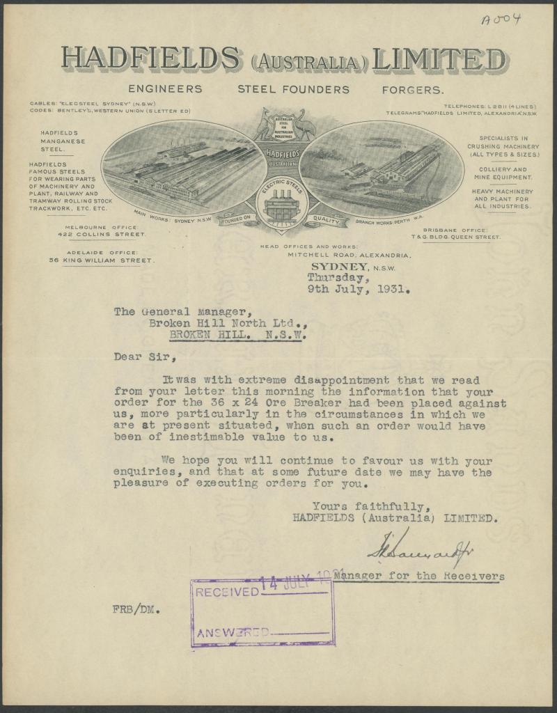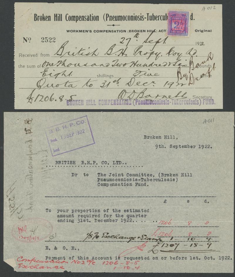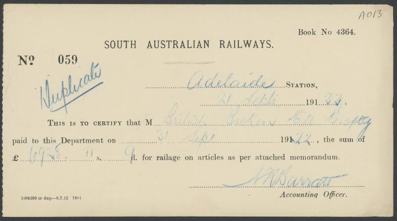 Company, The Gibraltar Consolidated Gold Mines, etc; 1840s Burra Burra Mines cheque; 1851 record of Copper Ore delivered by South Australia Mines; 1912-34 Broken Hill receipts (120); 1960s Southern Aurora railway cabin signs (10), Poor/Fine