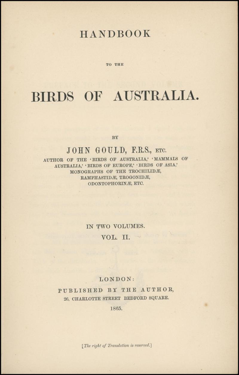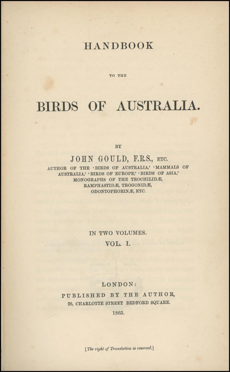 AUSTRALIA: 'The Birds of Australia - Volume 1 & 2', by John Gould (1865); first edition, written as a text-only supplement to the