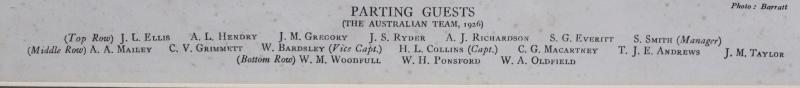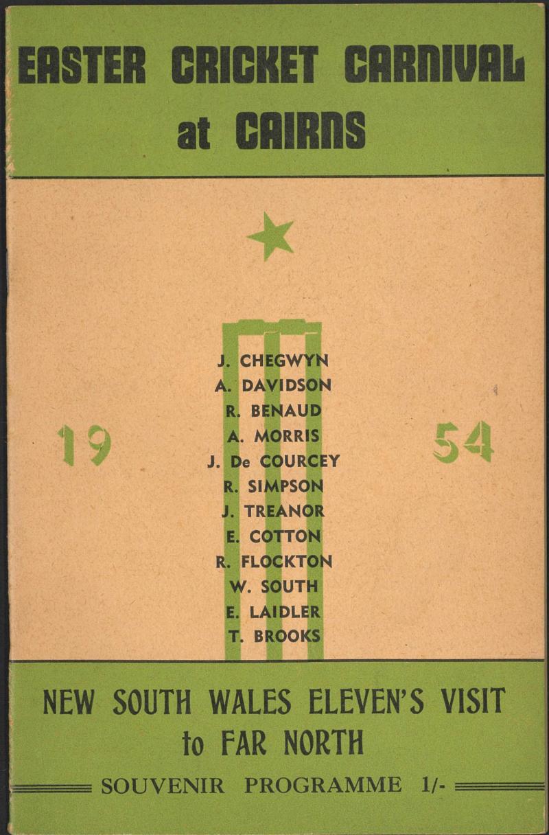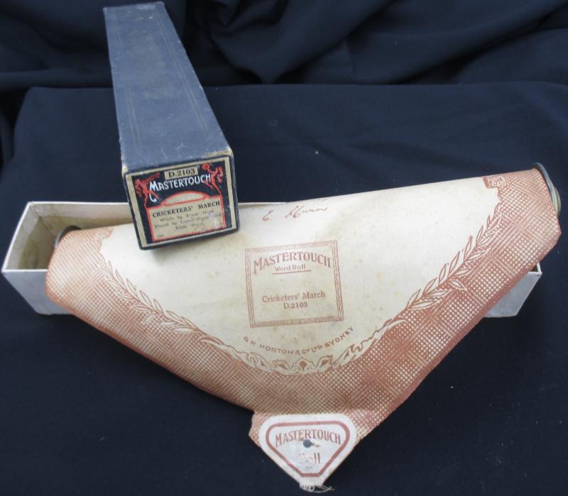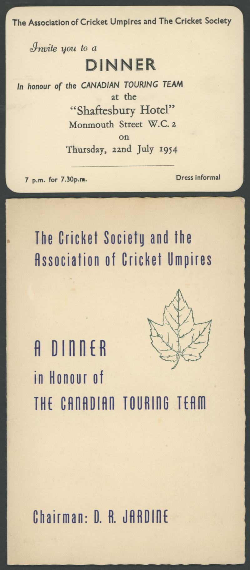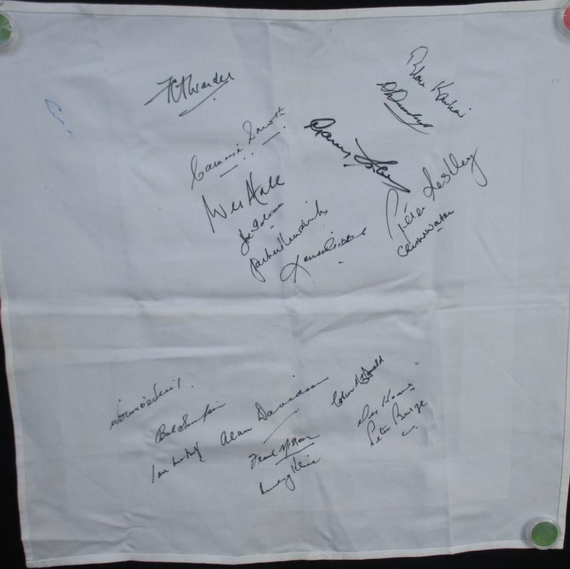 with 21 facsimile signatures; linen serviette signed by 1960 Australian (9) & West Indies (11) cricketers from Tied Test; pianola roll for 'Cricketers March'; silk scarf of cricketer; 1950 itinerary; menus (5); invitations (4); 1954 programme for