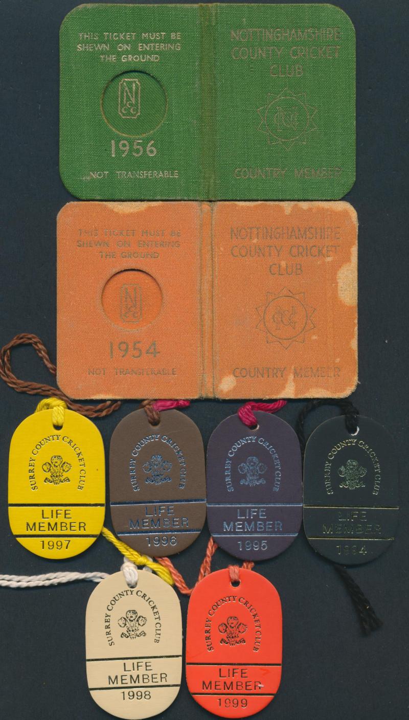 NSW tour to Cairns; telegrams (3); postcards (2); Xmas cards (2); photographs (2); tourist brochures (3); MCC Life Member ticket for 1987; Surrey Life Member tickets/cards (16) & badges (6); Nottinghamshire season tickets (2); various NZ tickets (7),
