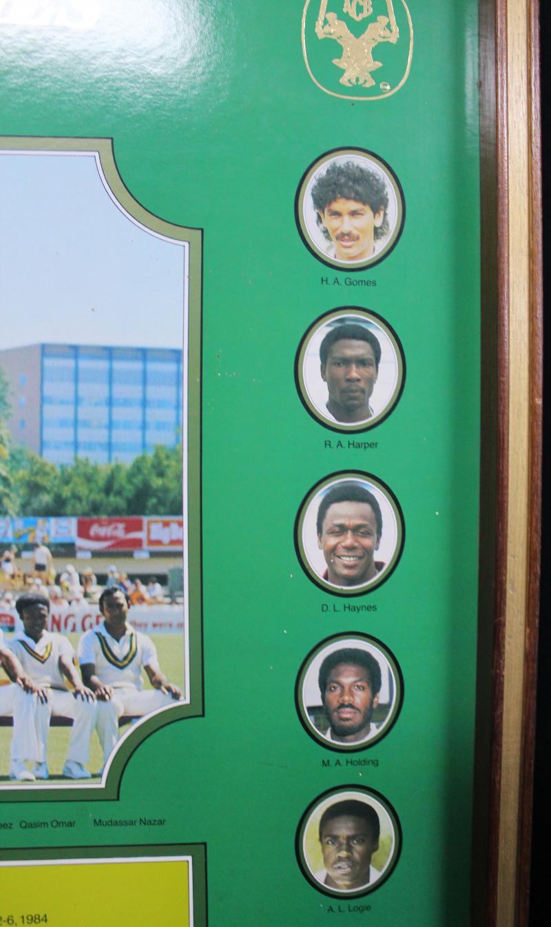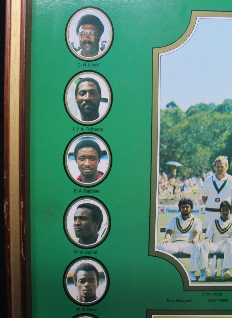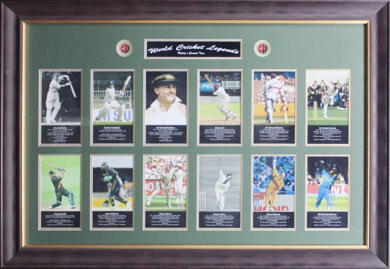 Hobbs, Sachin Tendulkar, Sir Donald Bradman, Brian Lara, Sir Vivian Richards, Sir Garfield Sobers, Jacques Kallis, Adam Gilchrist, Shane Warne, Dennis Lillee, Glenn McGrath & Muttiah Muralitharan, framed & glazed, overall 124x85cm. (Image1)