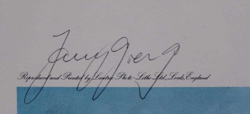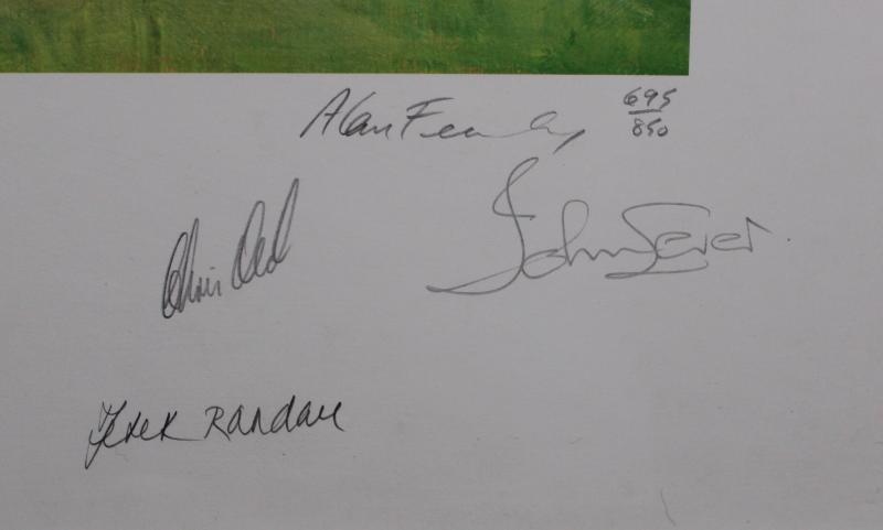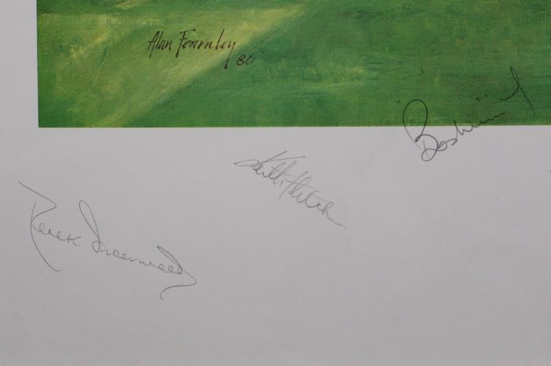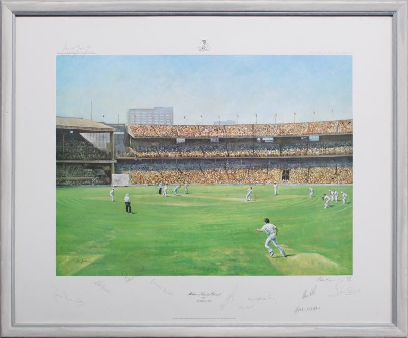 Framed displays 'Melbourne Cricket Ground' print by Alan Fearnley signed by 1977 England Centenary Test team; Bert Oldfield signed