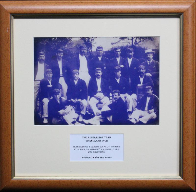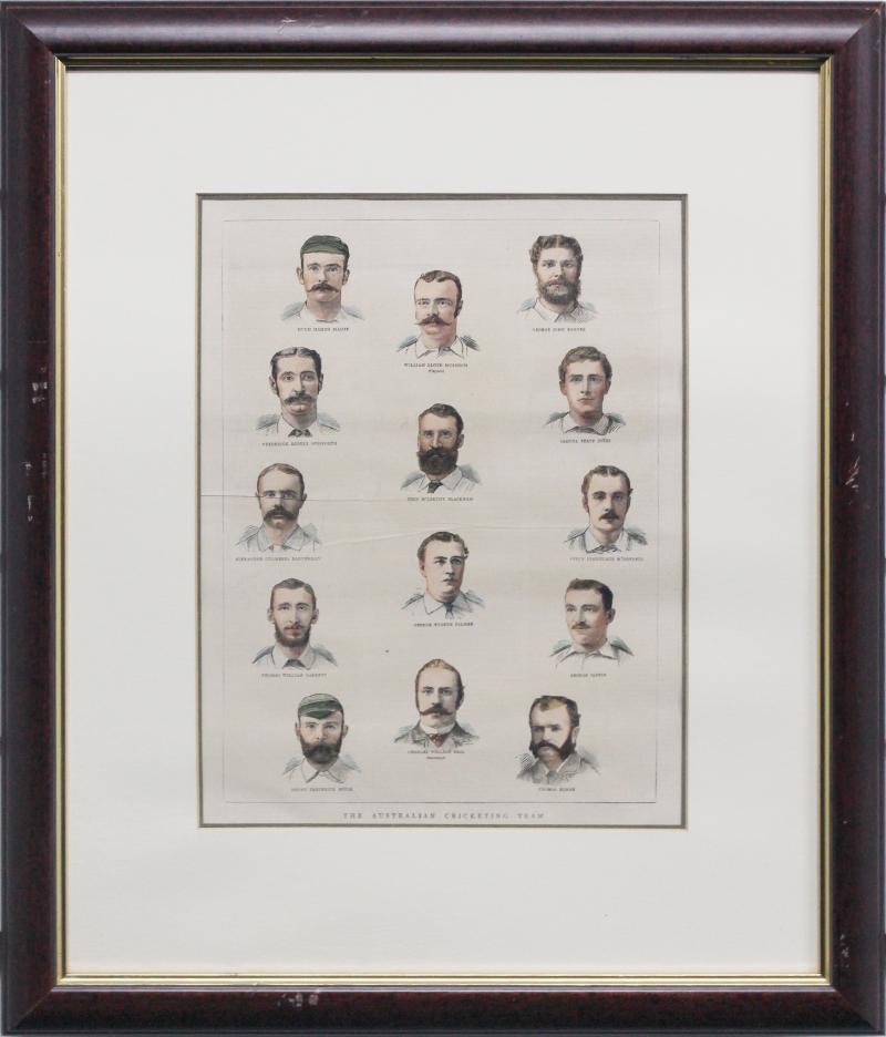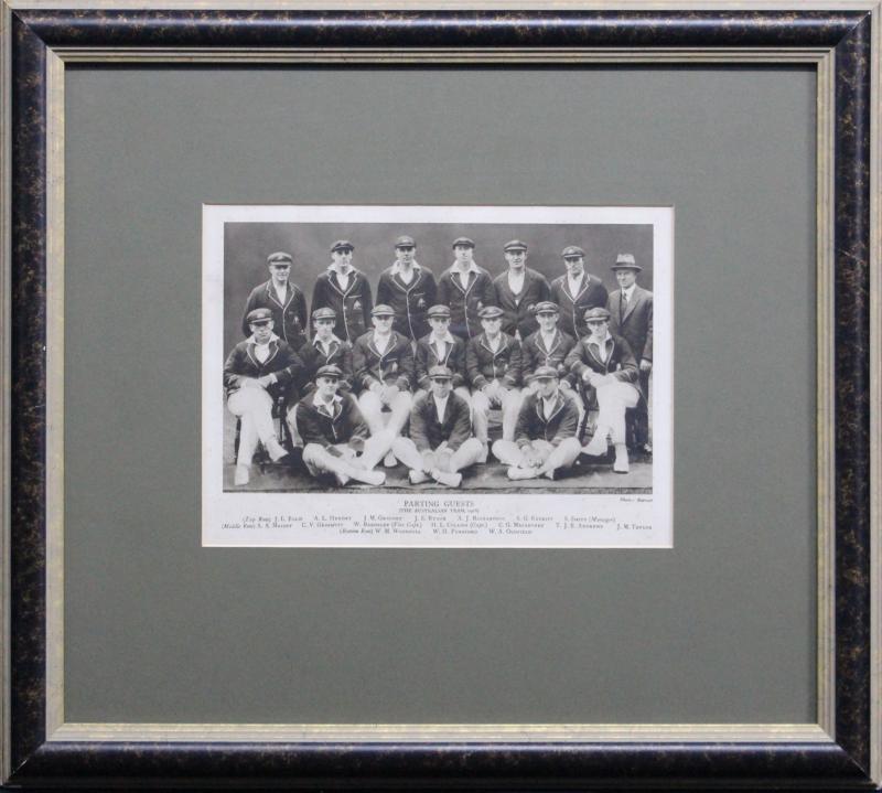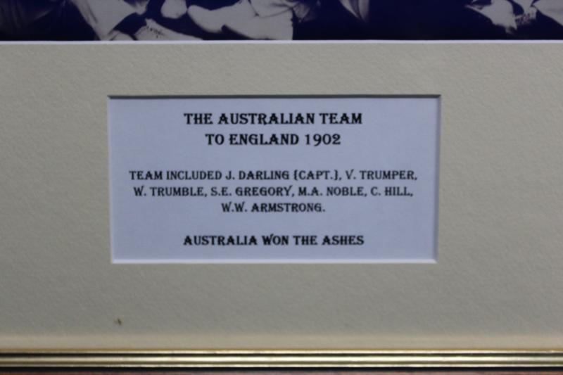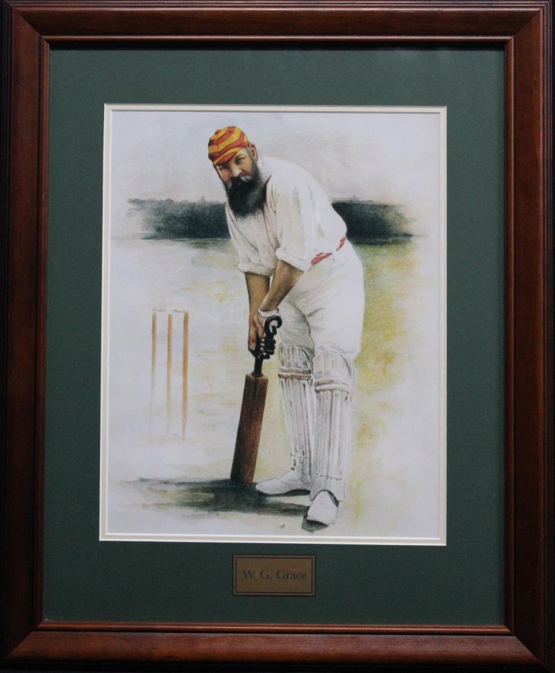 display; print of WG Grace; 1882 hand-coloured engraving 'The Australian Cricketing Team'; reprinted photograph 'The Australian Team to England 1902' ; print 'Parting Guests - The Australian Team 1926'; 'At the Cricket' oil on canvas board by Norma