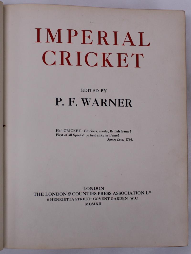 Book 'Imperial Cricket' edited by PF Warner [London, 1912], limited edition No.10 of 900, mainly Fine (few minor tone spots). (Image1) (Image2)