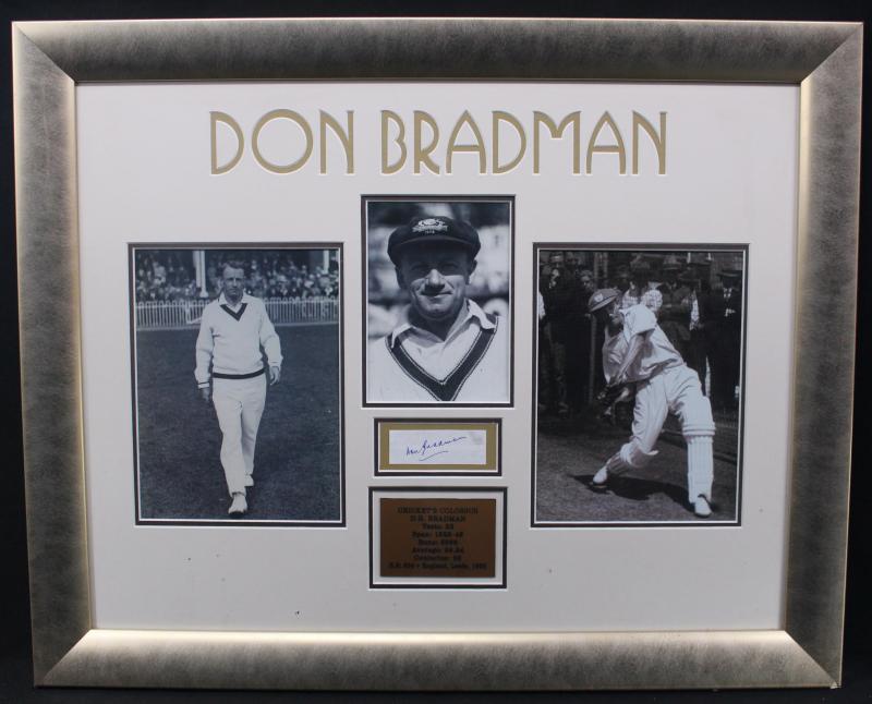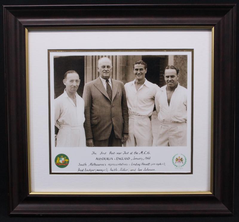 Framed Displays Signed display 'Don Bradman - Cricket Colossus'; reprinted 1947 photograph showing Lindsay Hassett, Fred Lockyer,