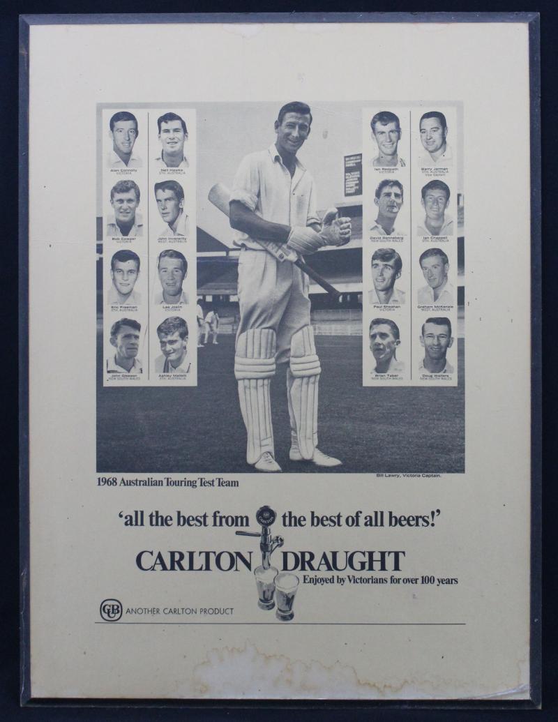 Keith Miller & Ian Johnson; 'Carlton Draught - 1968 Australian Test Team', all framed, various sizes, mainly Fair/Fine.