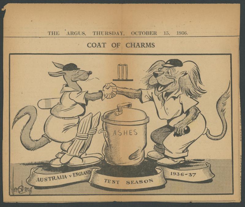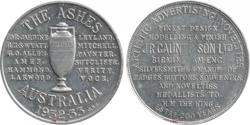 Medallion in aluminium, obverse showing Ashes Trophy, and inscribed with English Test Team player names and 'AUSTRALIA 1932-33',