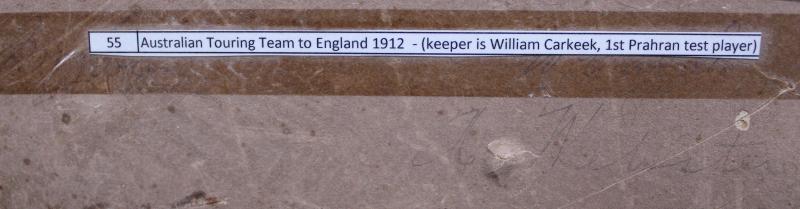 Peter McAlister, Jack O'Connor, Victor Trumper, Roger Hartigan, Hanson Carter, Vernon Ransford, Bill Whitty, Bert Hopkins, Monty Noble, Warwick Armstrong, Charlie Macartney, Syd Gregory & Warren Bardsley, window mounted with list of players,