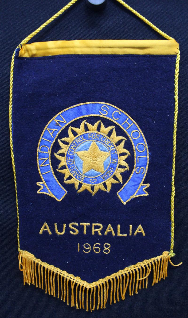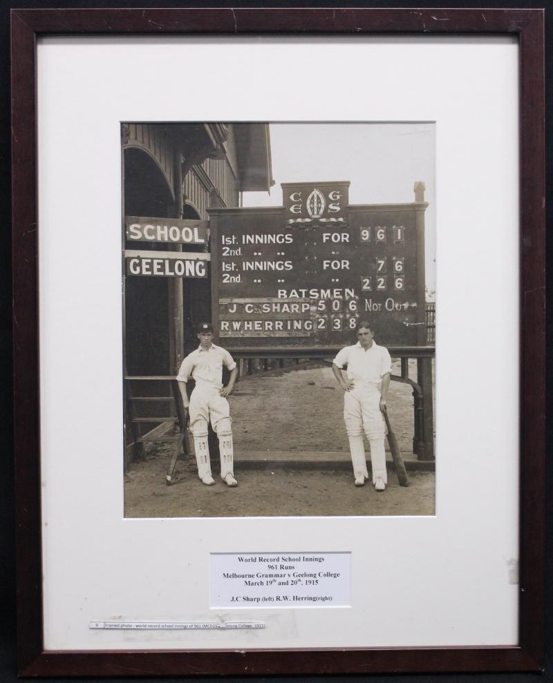 overall 58x46cm; photograph 'World Record School Innings, 961 Runs, Melbourne Grammar v Geelong College, March 19th & 20th 1915. JC Sharp (left) RW Herring (right); plus attractive pennant 'INDIAN SCHOOLS/Board of Control for Cricket in