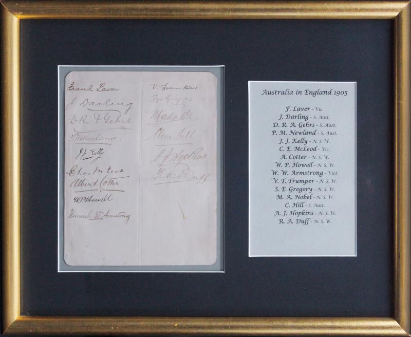 McLeod, Albert Cotter, Bill Howell, Warwick Armstrong, Victor Trumper, Syd Gregory, Monty Noble, Clem Hill, Bert Hopkins & Reggie Duff, window mounted with list of players, archivally framed & glazed, overall 42x32cm. (Image1)