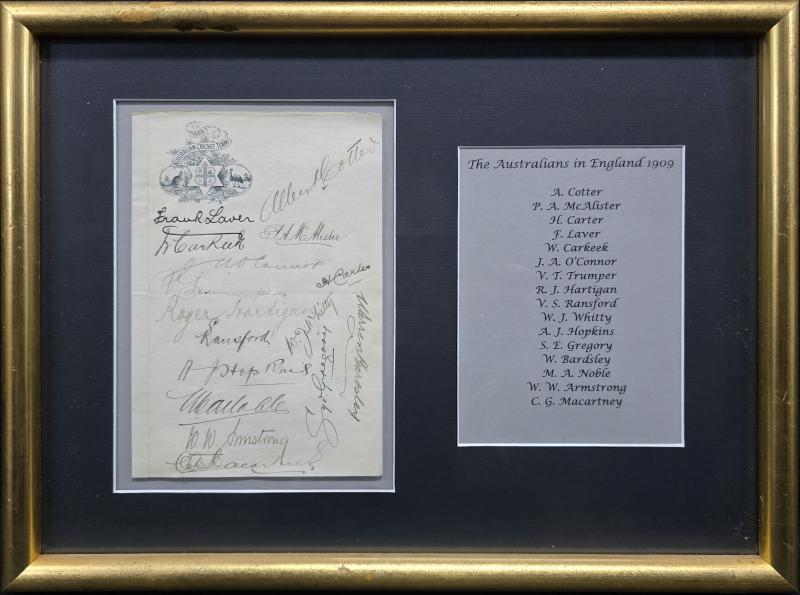 1909 Australian Team letterhead '1909 Australian Cricket Team' with 16 signatures - Frank Laver, Albert Cotter, William Carkeek,