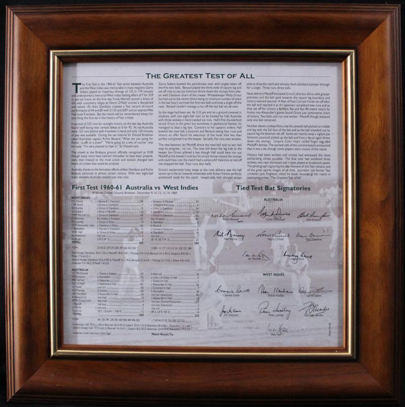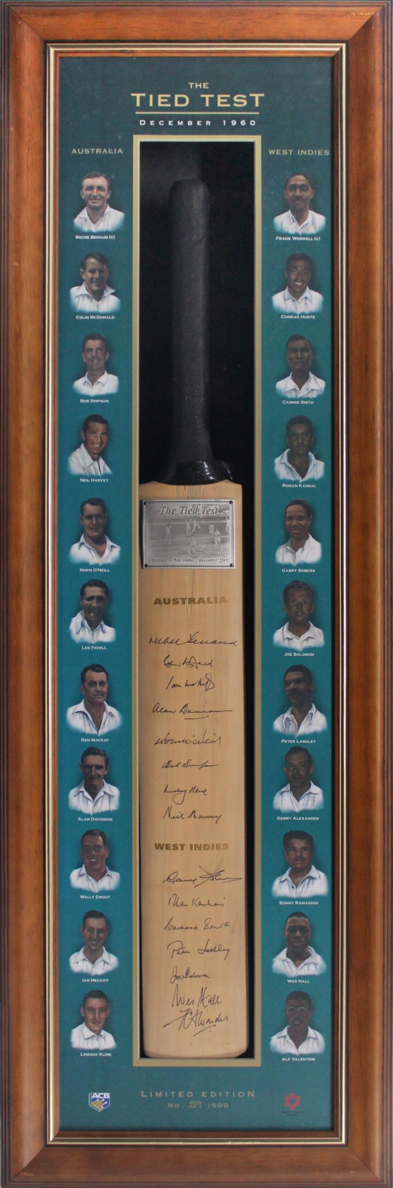 1960 Australia v West Indies Tied Test commemorative bat with 8 Australian & 7 West Indies signatures including Richie Benaud, Alan