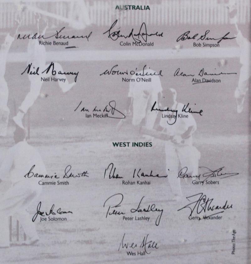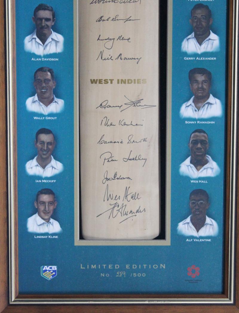 Davidson, Neil Harvey, Gary Sobers, Rohan Kanhai & Wes Hall, limited edition 289/500, mounted in attractive display case, overall 37x111cm. Plus scorecard (framed 37x37cm).