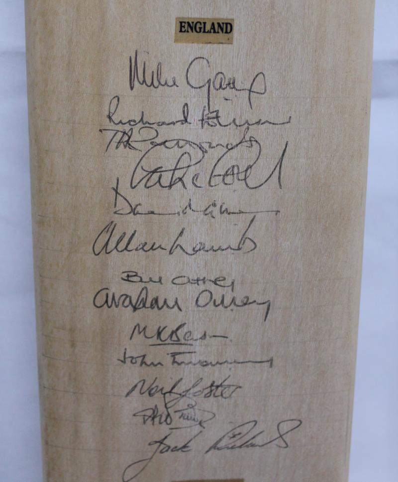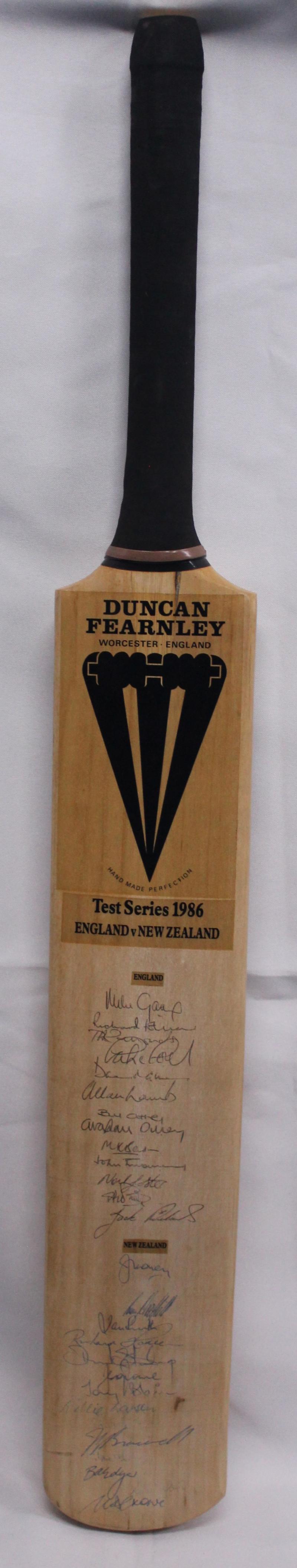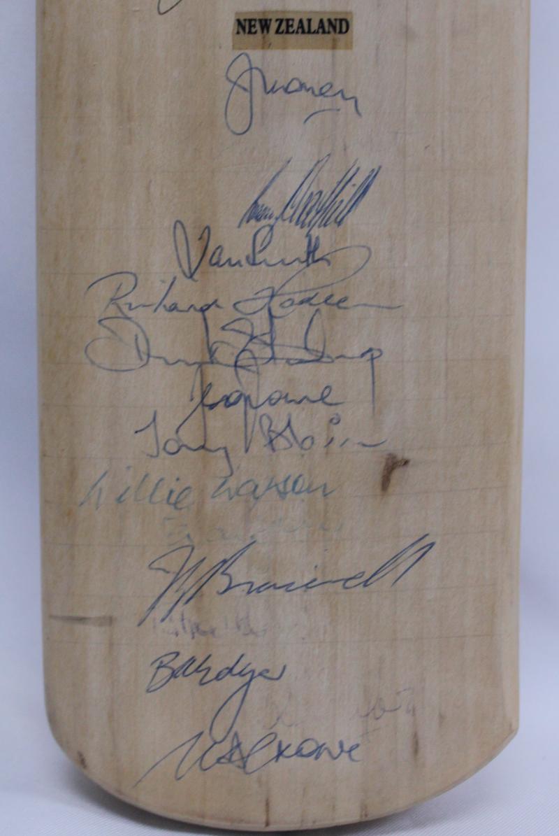 teams, with 25 signatures, mounted in display case, overall 20x96cm; plus 1986 England v New Zealand bat signed by both teams, with with 24 signatures, Fine condition.
