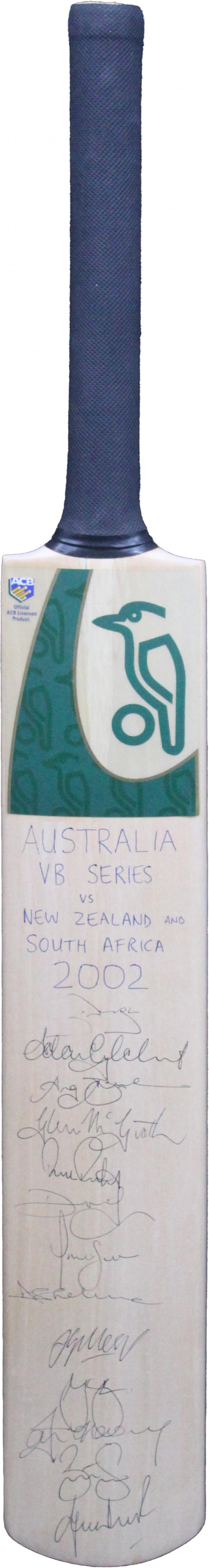 2002 Australian Team v New Zealand & South Africa 'Kookaburra' cricket bat with 13 signatures including Steve Waugh (captain), Adam