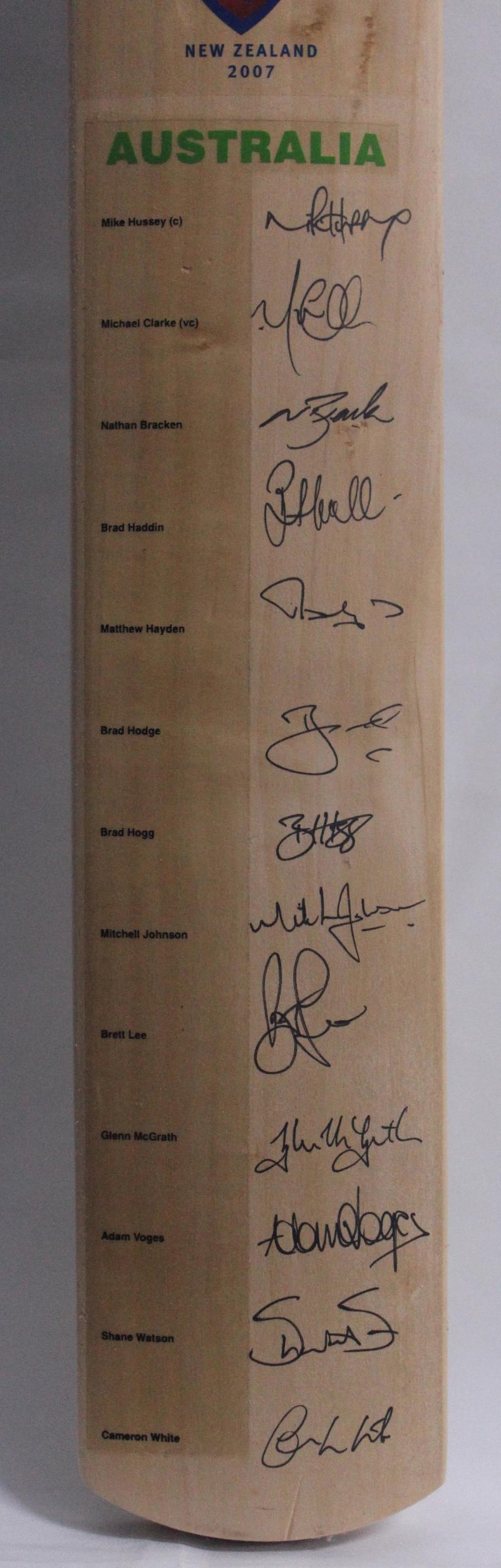 2007 Australian Team v New Zealand 'Kookaburra' cricket bat with 13 signatures including Mike Hussey (captain), Matthew Hayden,