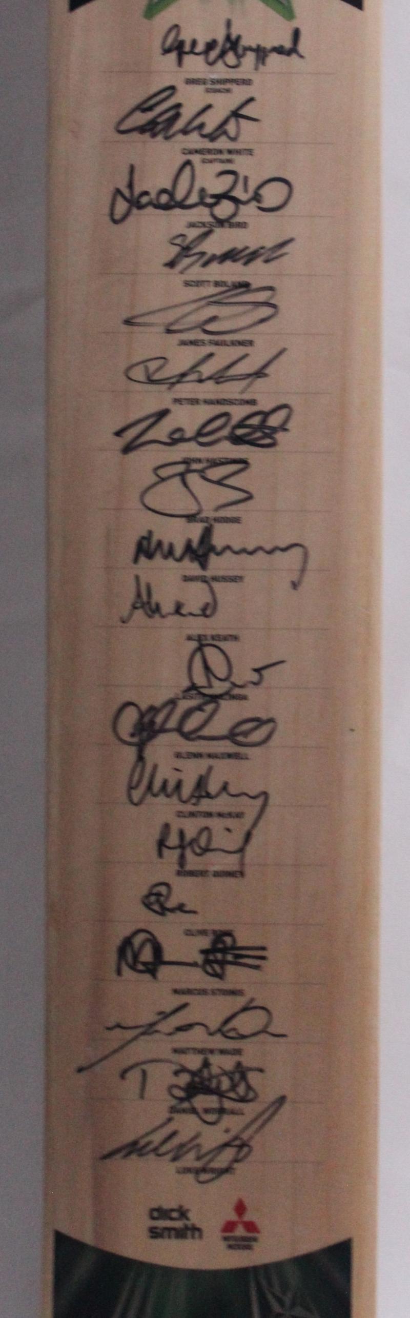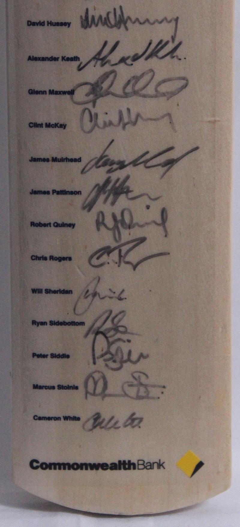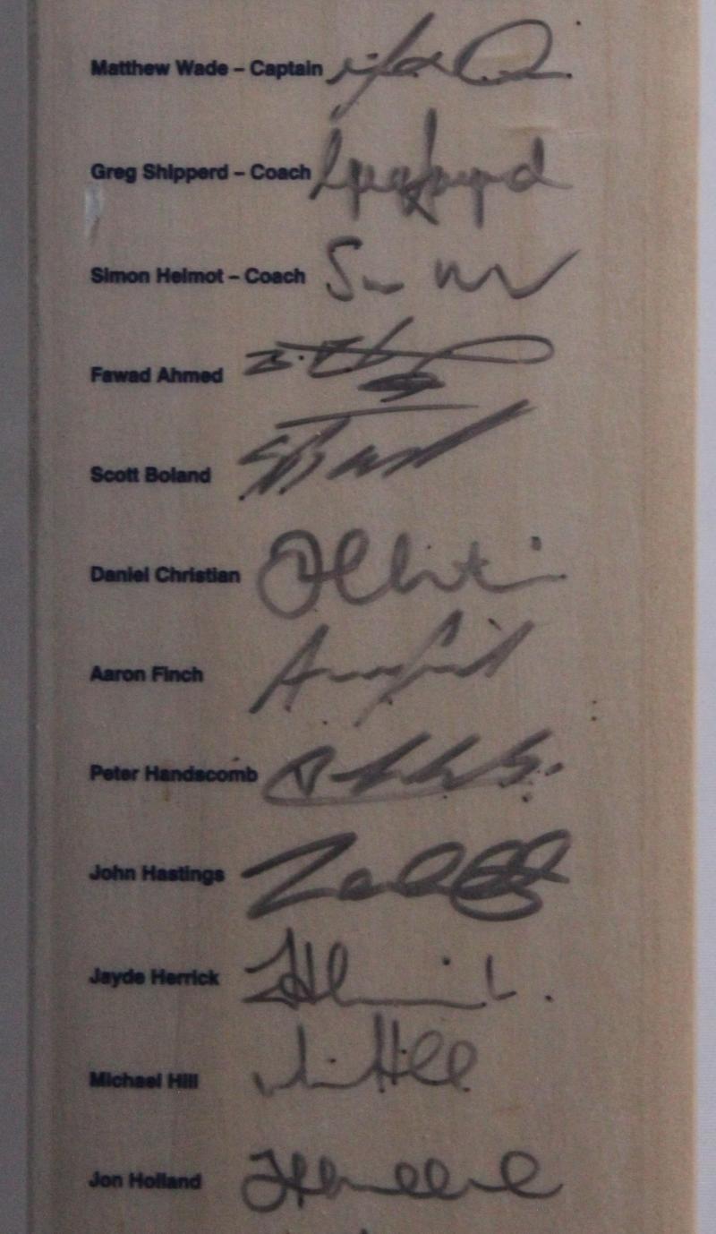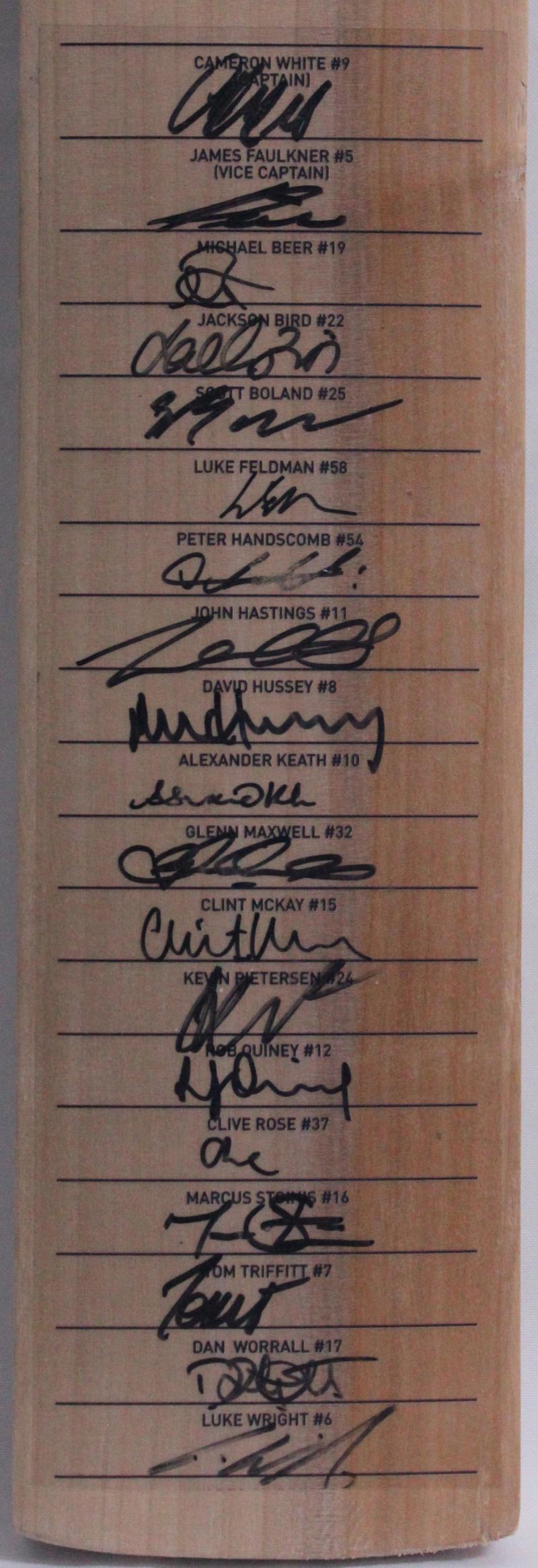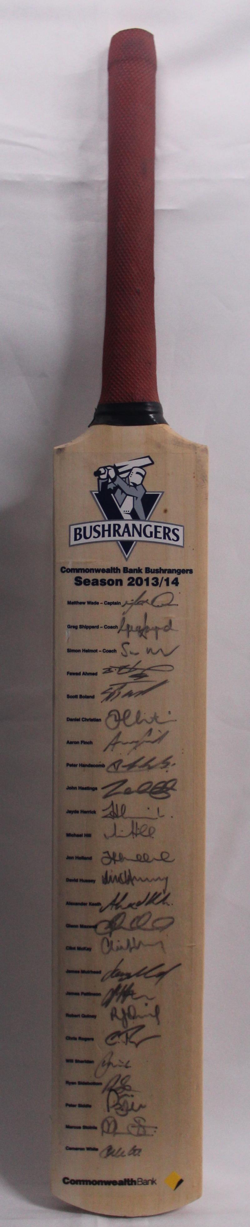 2013-14 Bushrangers cricket bat with 25 signatures including Matthew Wade (captain), Scott Boland, Glenn Maxwell & David Hussey,