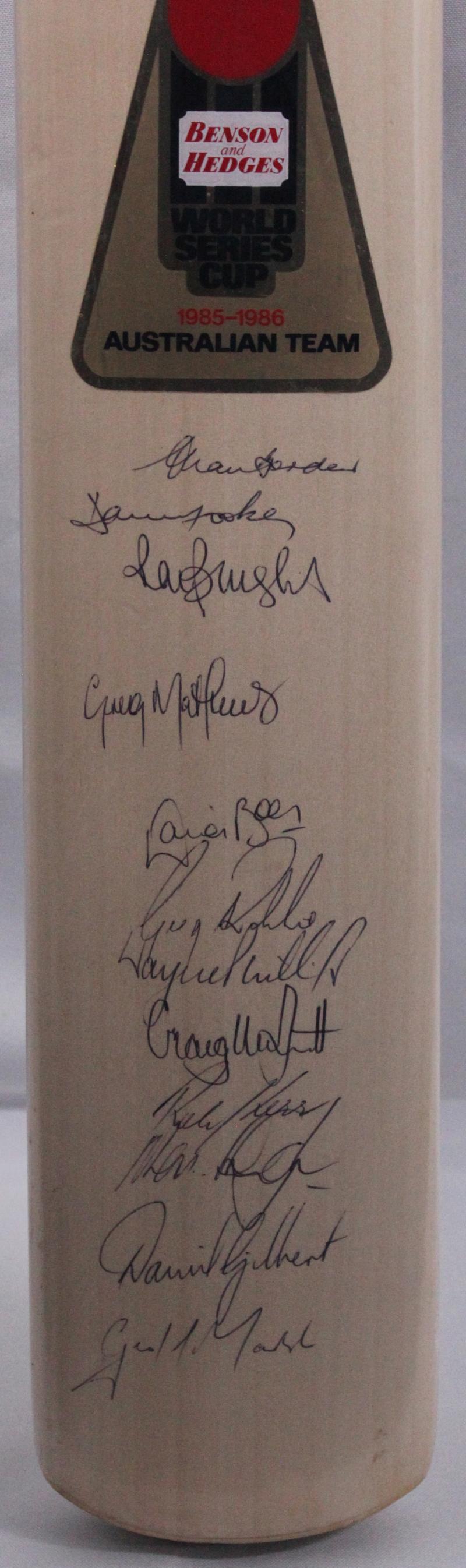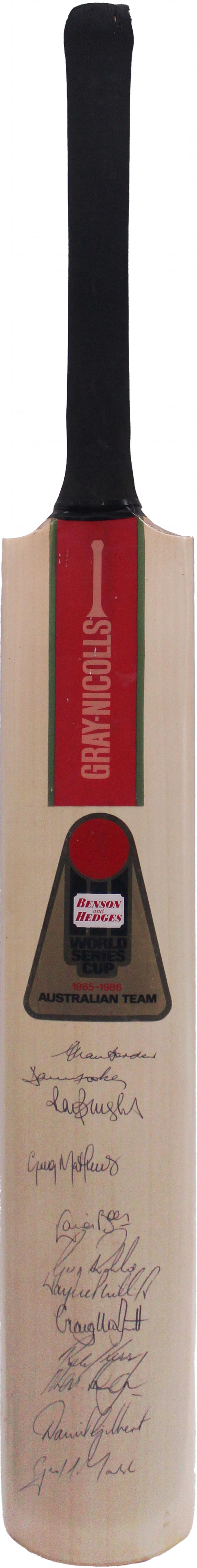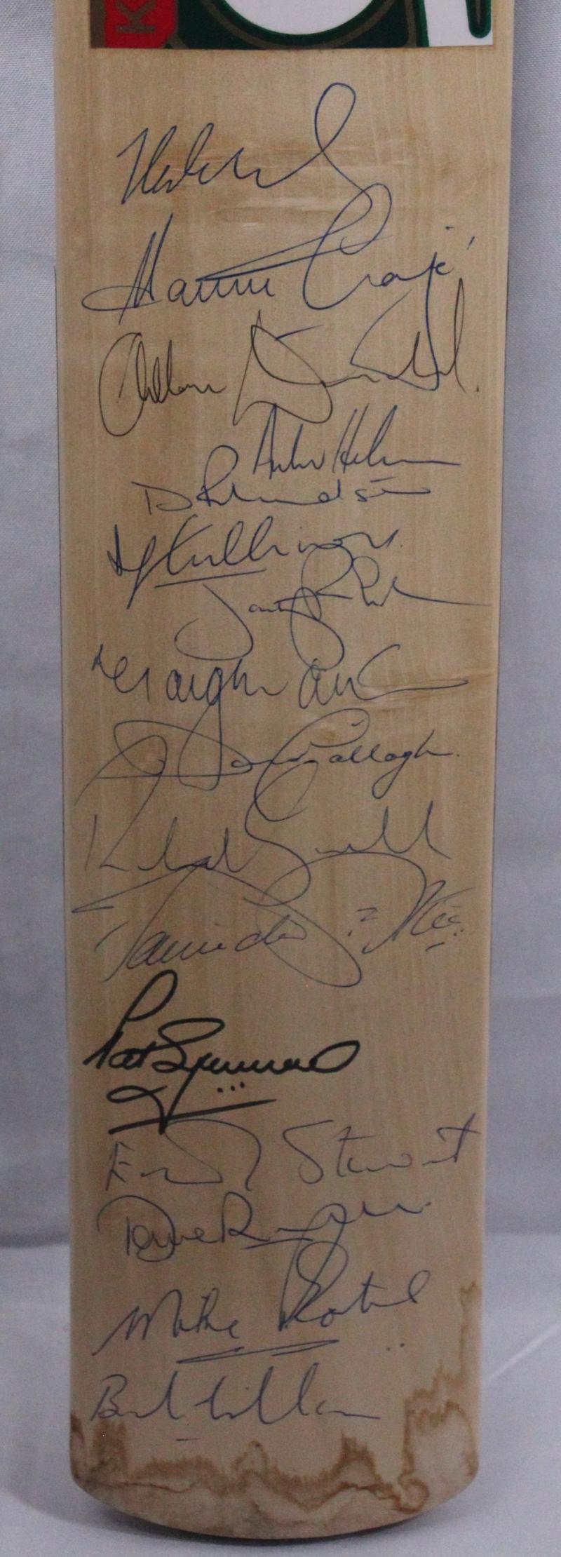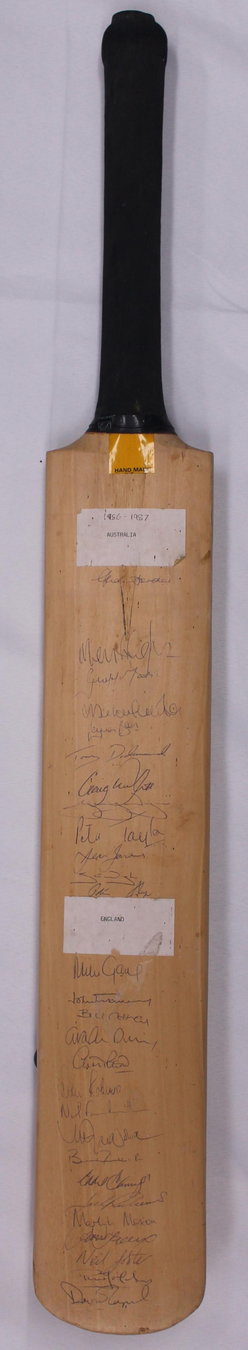 1986-87 Australia v England full size cricket bat, signed on front by both teams with 29 signatures including Allan Border, Dean