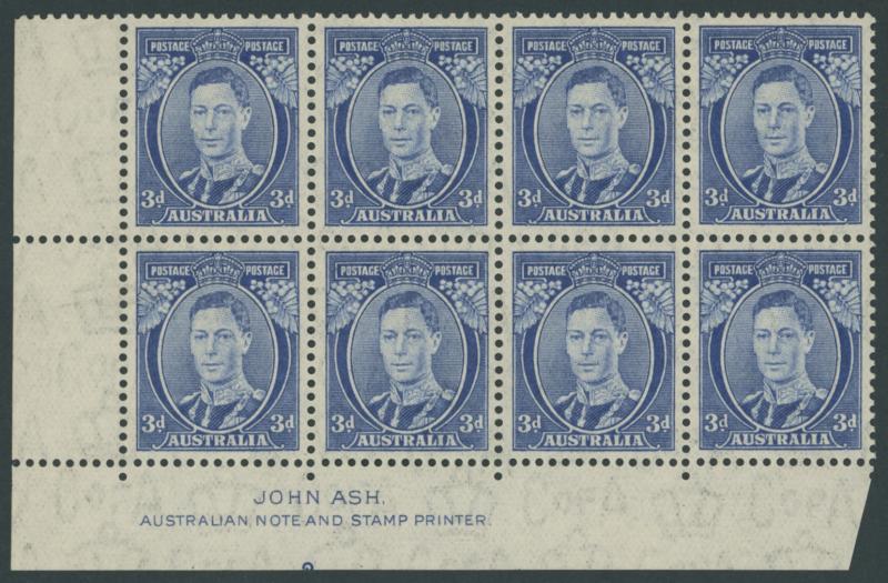 1937-49 Definitives Perf 15x14 KGVI 3d blue SG 186 Die II Thin Paper John Ash Imprint block of 8 (4x2) ACSC 194za, very