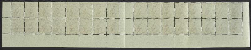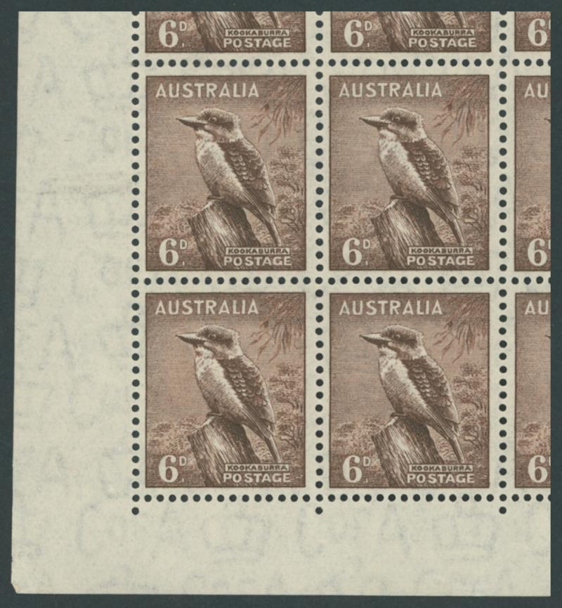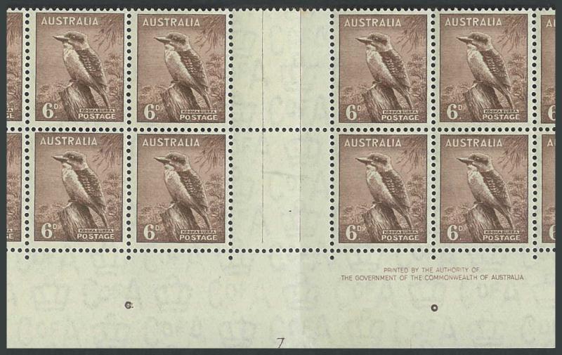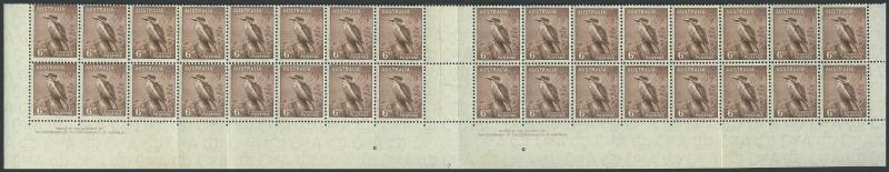 1937-49 Definitives Perf 15x14 Kookaburra 6d brown SG 190 gutter block of 32 (16x2) from the base of the sheet with complete Plate