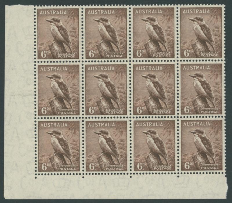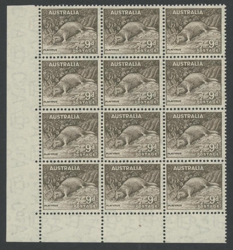 1937-49 Definitives Perf 15x14 6d Kookaburra, 9d Platypus & 1/- Lyrebird SG 190-2 lower-left corner blocks of 12 (4x3 or 3x4) each