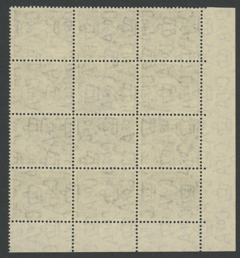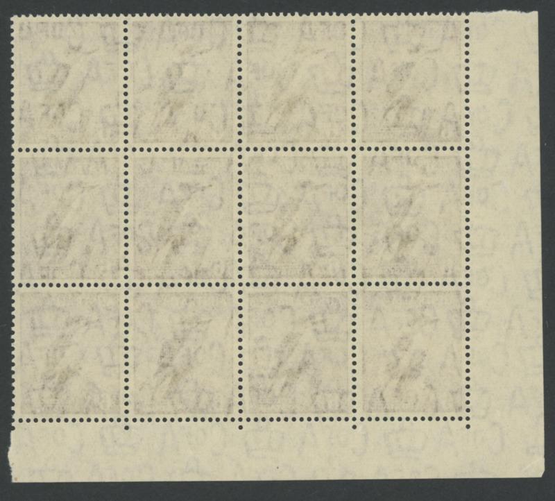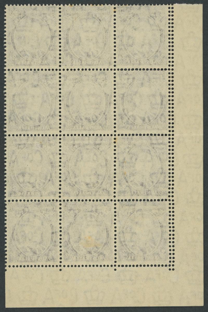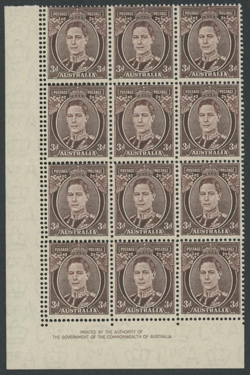 1937-49 Definitives Perf 15x14 KGVI 3d purple-brown SG 187 corner block of 12 (3x4) from the lower-left of the sheet with Authority