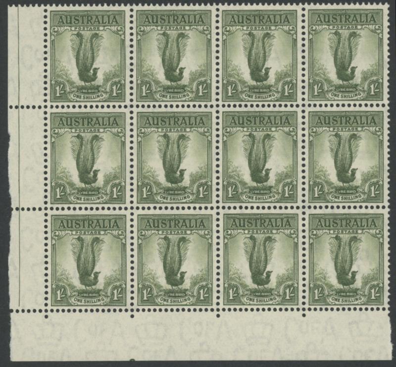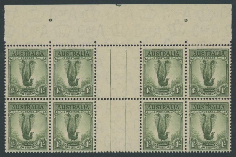 1937-49 Definitives Perf 15x14 Lyrebird 1/- green SG 192 gutter block of 8 (4x2) from the top of the sheet with largely complete
