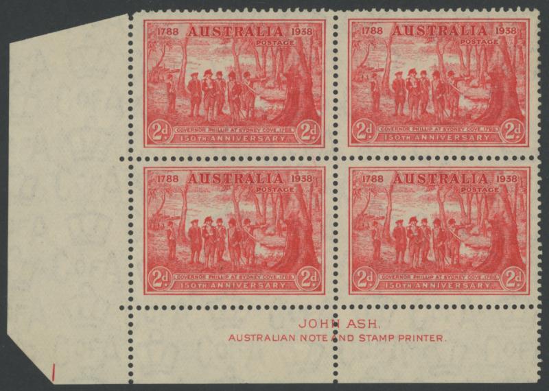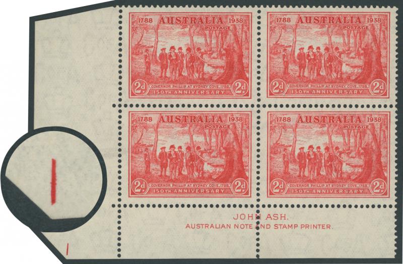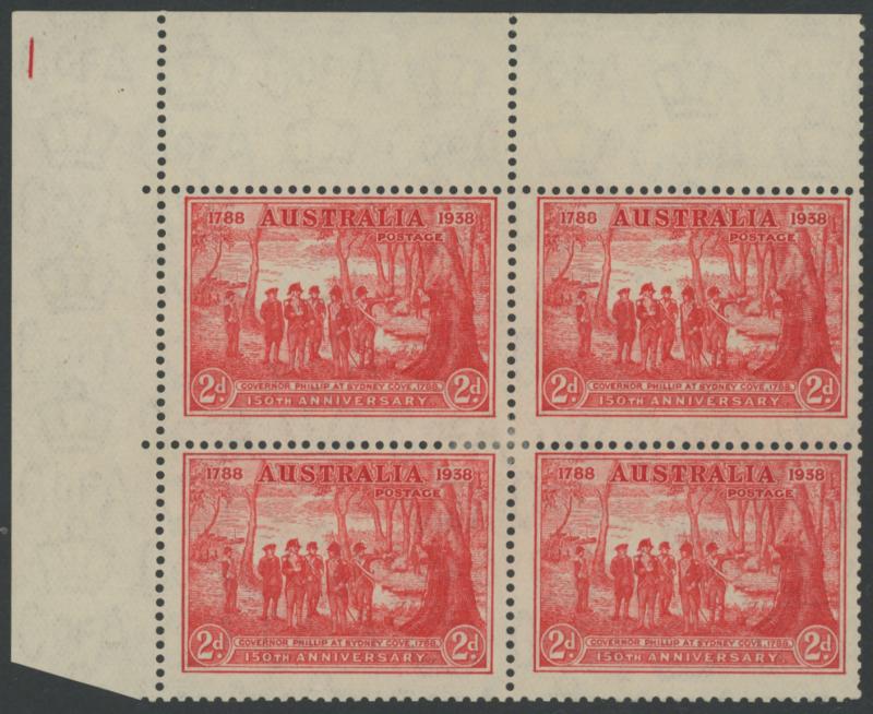 1937 NSW Sesquicentenary 2d scarlet SG 193 lower-left imprint block of 4 with complete Plate Number ' 1 ' ACSC 175za, unmounted,