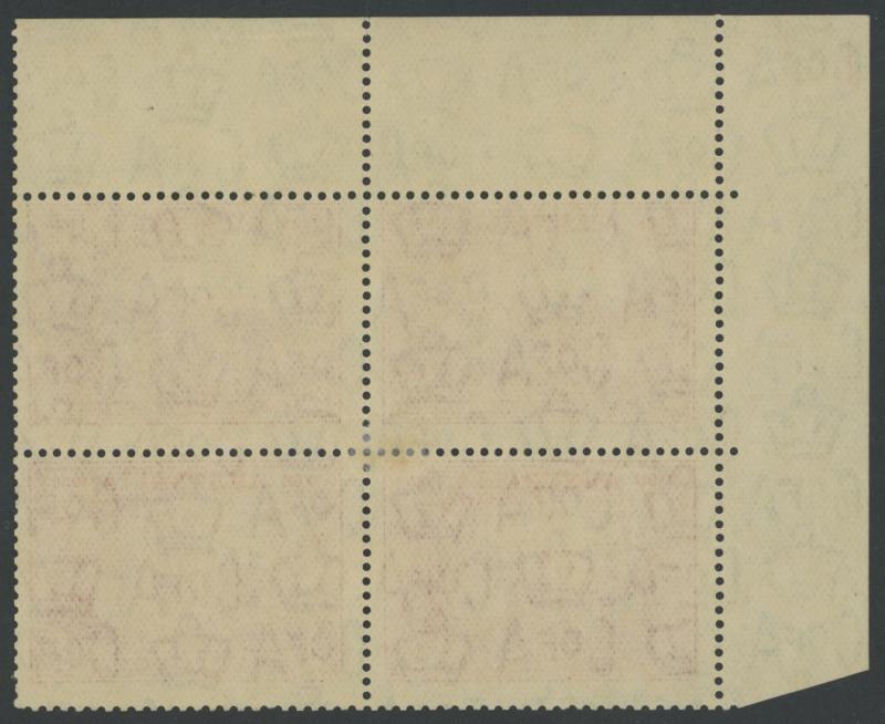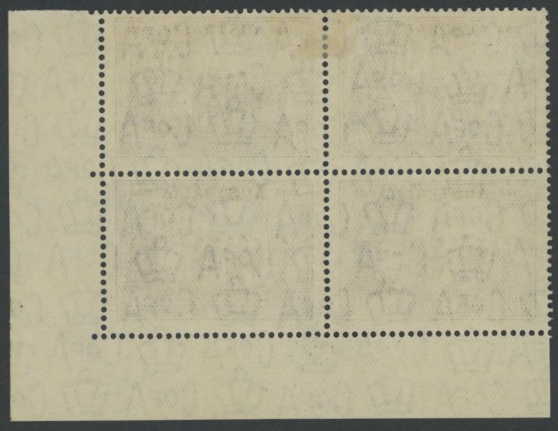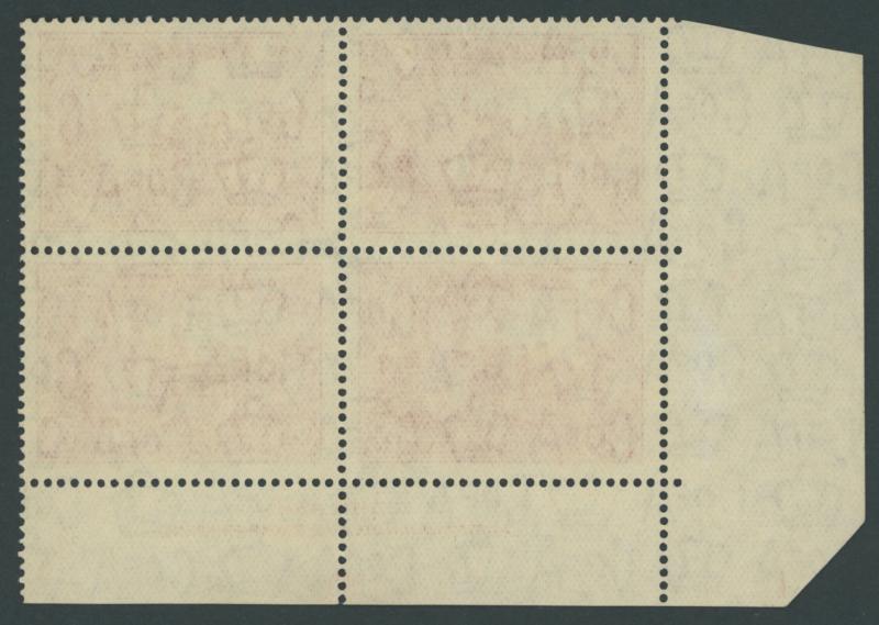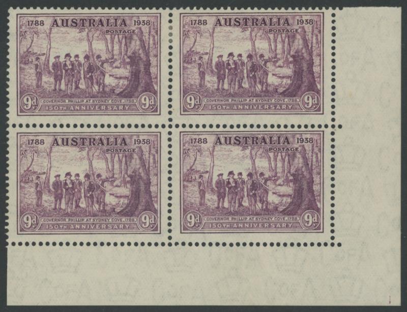 1937 NSW Sesquicentenary 9d violet SG 195 lower-right corner block of 4 with lightly-printed but complete Plate Number ' 1 ', minor