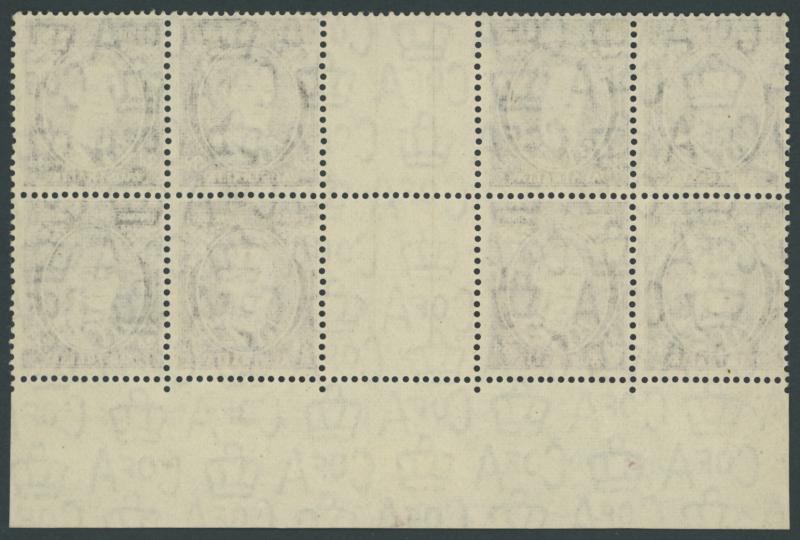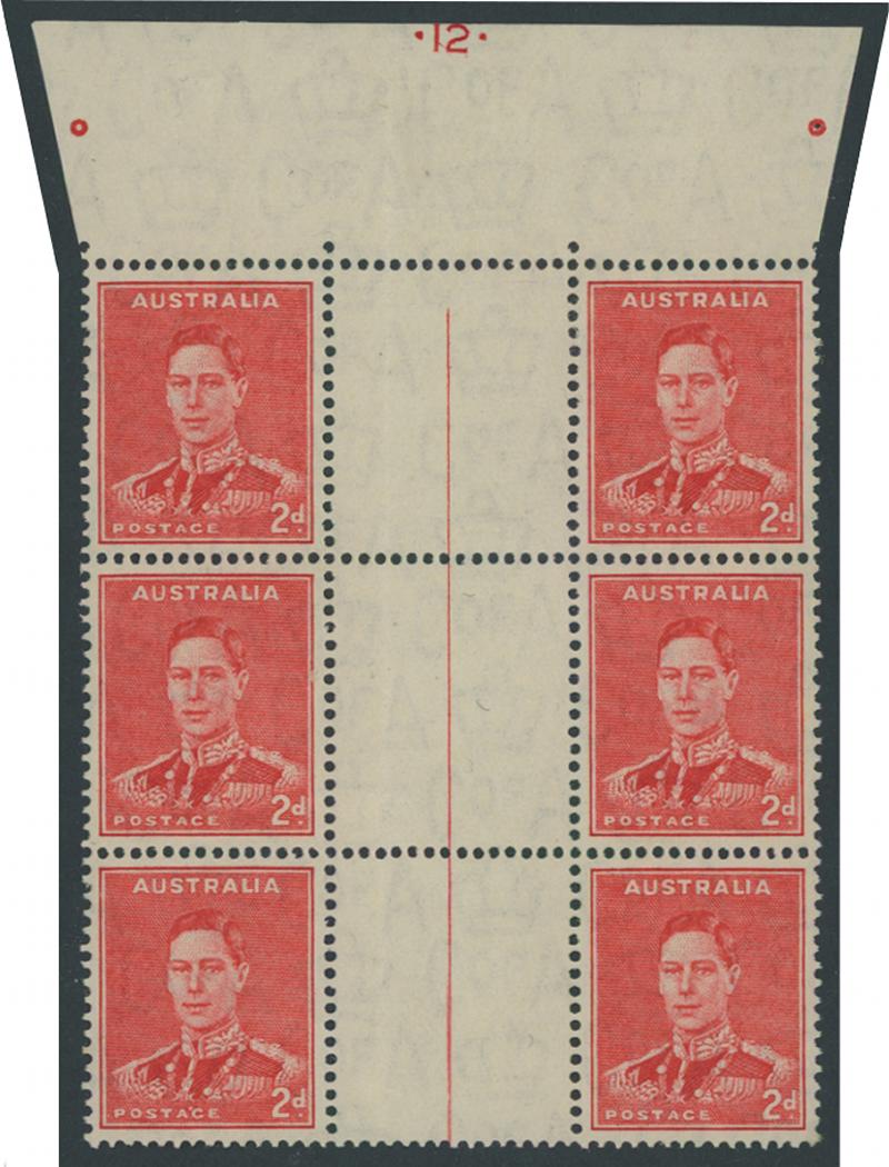 1937-49 Definitives Perf 15x14 KGVI 2d scarlet Die II SG 184 gutter block of 6 (2x3) from the top of the sheet with complete Plate
