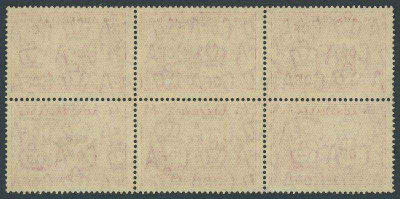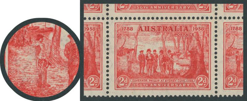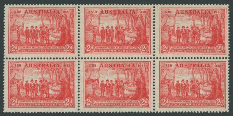 1937 NSW Sesquicentenary 2d scarlet SG 193 block of 6 (3x2) with Pantaloon Flaw Retouched State I ACSC 175fa [Pos L10/2] which is