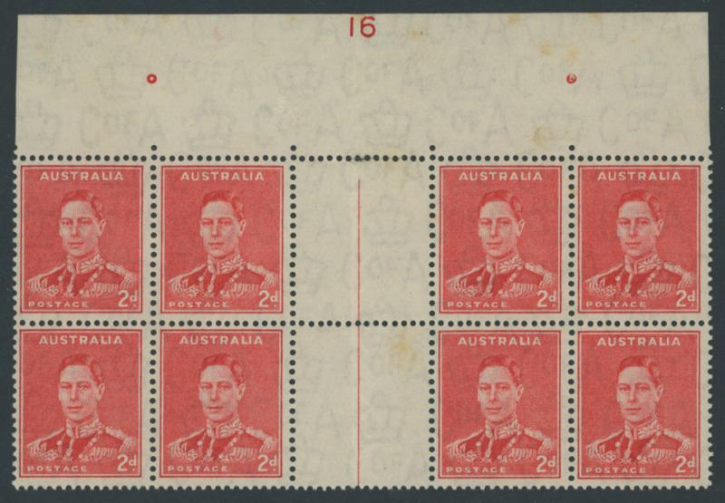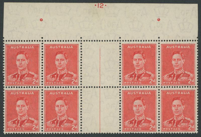 1937-49 Definitives Perf 15x14 KGVI 2d scarlet Die II SG 184 gutter block of 8 (4x2) from the top of the sheet with complete Plate