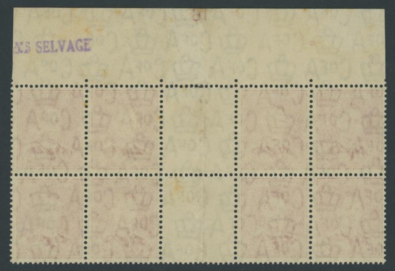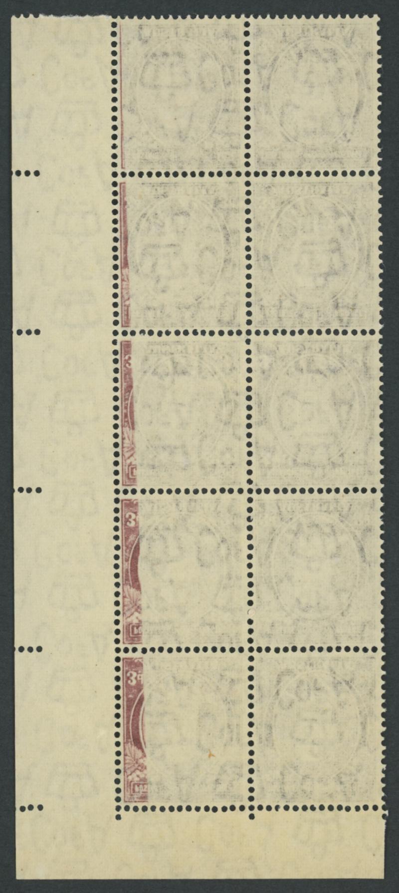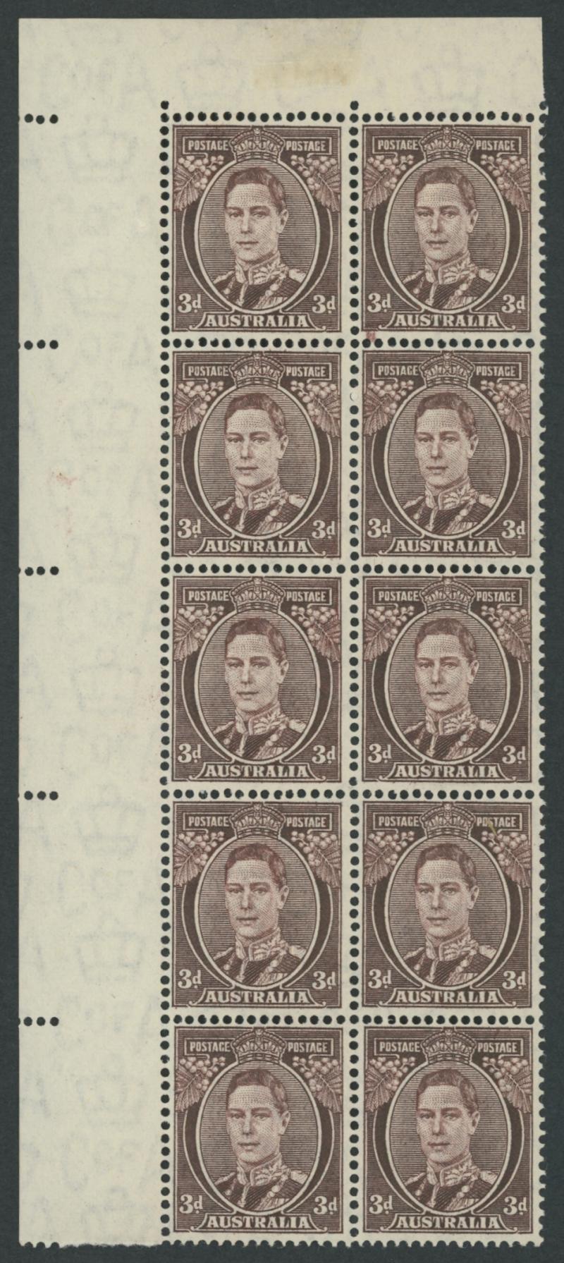1937-49 Definitives Perf 15x14 KGVI 3d purple-brown SG 187 corner block of 10 (2x5) from the upper-left of the sheet with partial