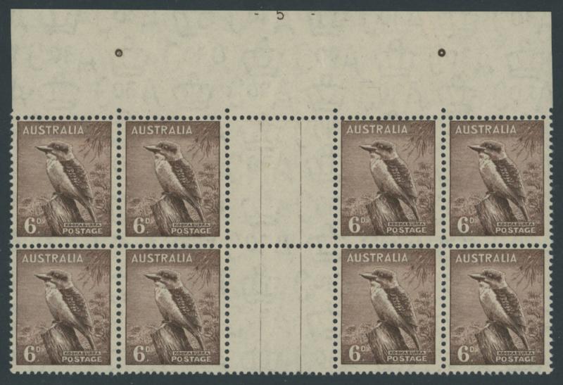 1937-49 Definitives Perf 15x14 Kookaburra 6d brown SG 190 gutter block of 8 (4x2) from the top of the sheet with largely complete